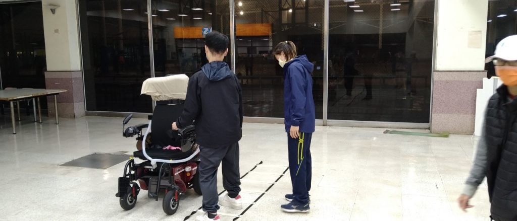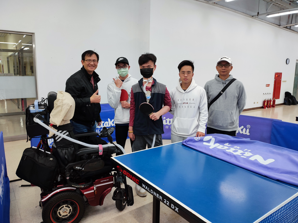安排學生至鄰近大學實習,協助重症與身障者,仍可透過電動輪椅與呼吸器,進行體能訓練與特殊桌球課程—以帆布調整桌球面積,有效促進專項之學習。(圖:朱彥穎教授)