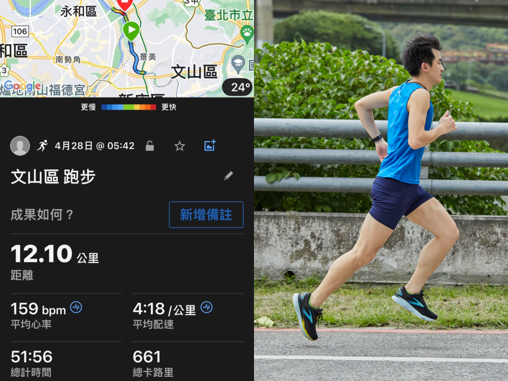 寶藏巖 12 公里配速 4:18/km,表現穩定,前中後段均能感覺到跑鞋強大的助力!實測柏油路面跑起來,不會因為堅硬的地面而影響 BROOKS GHOST 16 的緩震效果,感受到強大的彈力回饋,經過落葉、標線時,出色的抓地力大大降低打滑的風險。