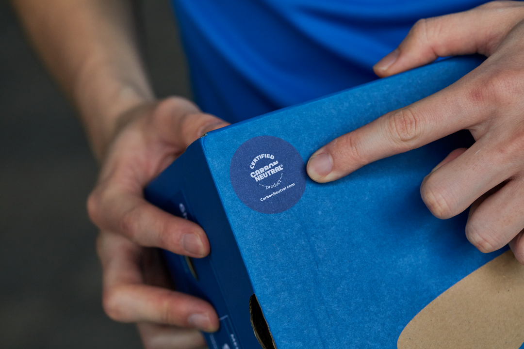 GHOST 16 鞋盒上有碳中和認證標籤。BROOKS 是友善環境的標竿品牌,跑出環保永續。(攝影:劉曉天)