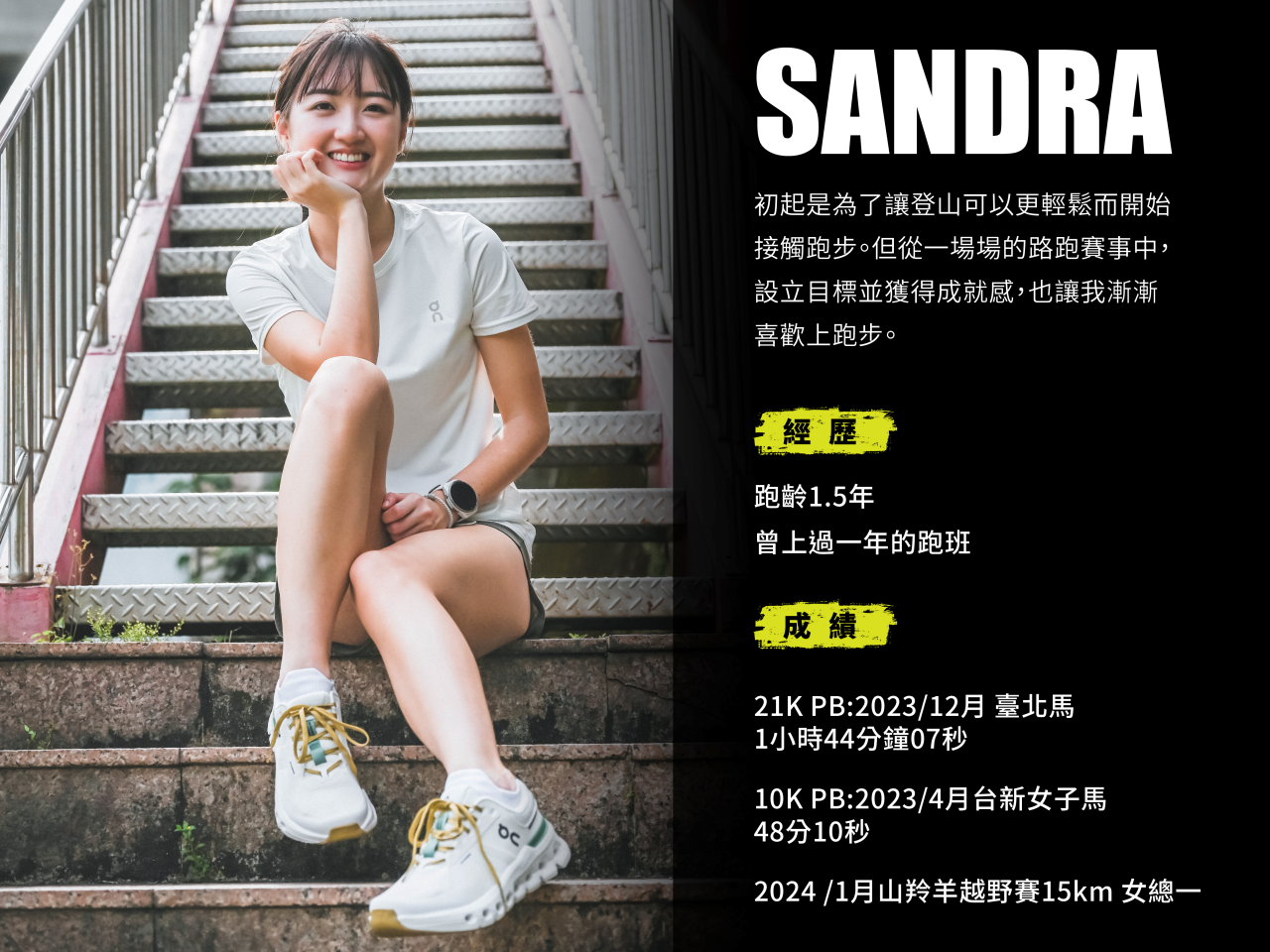 踏進一個未知的領域,買新跑衣、跑錶、跑鞋,每件事都覺得新奇有趣。起初練跑還是會覺得痛苦想偷懶,但也許是愛買的天性,穿上新買、好看的跑衣跑鞋,讓我更期待每一次的訓練。當然也從一場場的路跑賽事中設立目標找到成就感。隨著一張張表情進步的賽事照片,實際感受到離理想中的自己更近了些,回頭才發現,我喜歡上跑步的自己了!