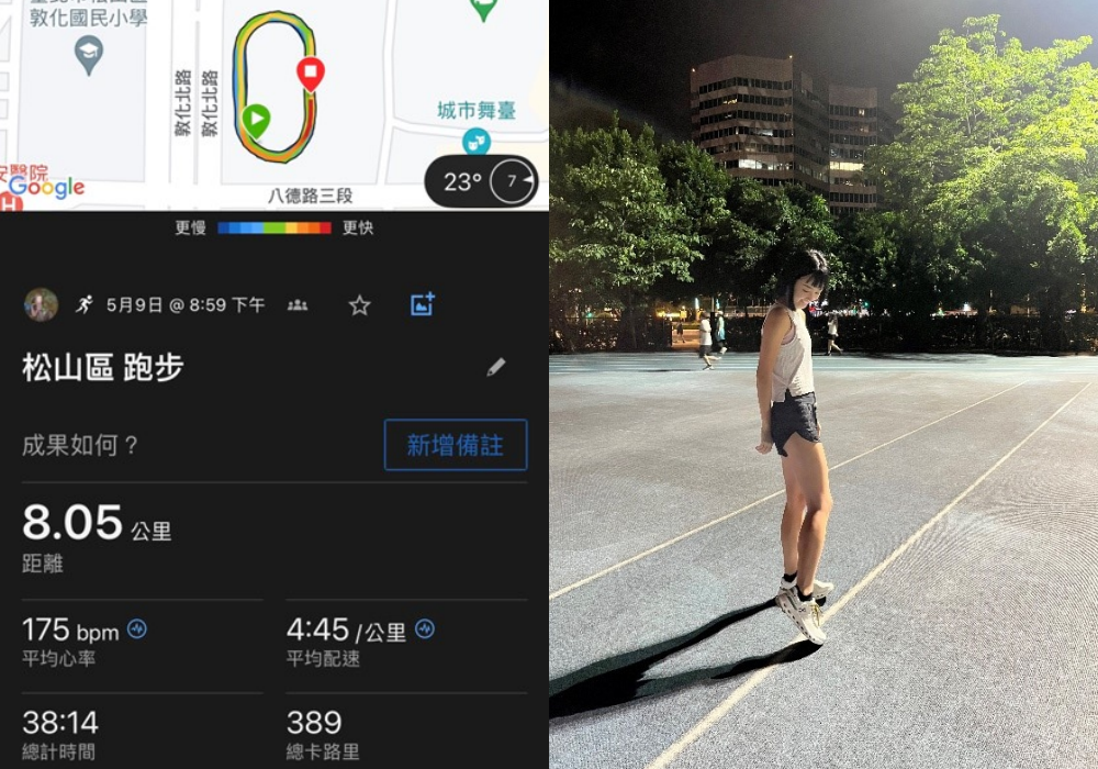 到了會場看見很多穿著專業運動服的漂亮女生,配著她們健美的腿部線條,頓時讓我喪失自信。跑完後,因為對成績沒什麼概念倒還好,但是大會照片一出來,看著跑姿歪七扭八、跑到面目全非、穿搭還很怪異的自己,才真的是崩潰。那時候的我充滿挫折,覺得跑步很累之外也沒什麼快樂的地方,還看起來很醜。消沉了一陣子後,我決定朝當初在會場看見的那些漂亮女生邁進,開始研究跑姿、如何發力、什麼是配速等等,甚至加入了跑班。