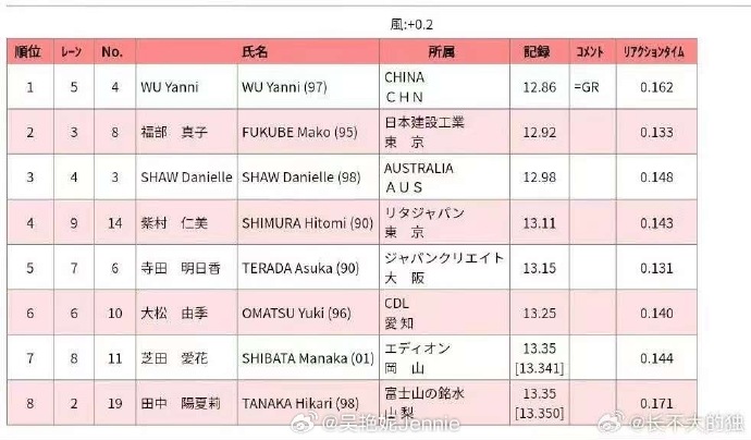 中國跨欄選手吳艷妮在鑽石聯賽廈門站女子 100 公尺跨欄失利後,曾在訪問中表示:「下一場蘇州站要突破 13 秒是很輕鬆的,我在想可不可以達到 12 秒 9,或是自己的 PB (12 秒 76)。」然而卻再次墊底收場,引發網友熱議。而在近期日本木南道孝記念賽上,吳艷妮的狀態終於回來了,不但摘下后冠,更跑出了亞洲今年第一快的成績。