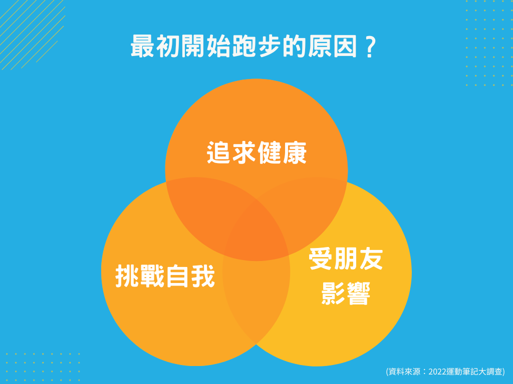 你知道嗎?從運動筆記大調查結果顯示,很多人開始跑步的三大原因是為了健康、追求成就感、以及受朋友的影響。一般人從 25 歲以後,每年大約會減少 1% 的心肺耐力,假如沒有運動習慣,到了 75 歲,便只剩下一半的能力!此外,隨著身體年齡的變化,肌肉量會快速流失,體脂肪也更容易累積。衛生福利部表示如果全民能適當運動,那因心臟病、糖尿病、大腸癌而死亡的人可以大大減少三分之一,還可以減緩因退化性或慢性疾病的發生機率,延續健康有活力的生活品質。