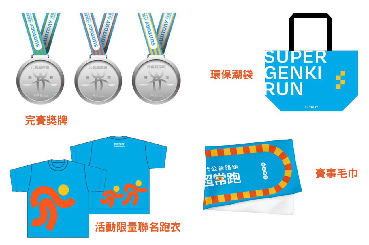 為了獎勵每位參賽者努力完賽,更精心準備了一系列完賽禮品,延續「元氣超常跑」理念,設計出精美獎牌、功能性跑衣、環保潮袋及賽事毛巾,每件禮品都在鼓勵持續的健康生活,不僅作為參賽紀念,更具實用價值,賽後依然能感受到賽事的滿滿能量。除此之外,還有超豐富完賽贈品:三得利保健食品芝麻明 EX、固力伸、躍勁分離乳清蛋白粉、白蘭氏鐵 + 維他命 B 群雞精錠、超實用的兩用冷熱敷袋...等等,非常讓人心動!