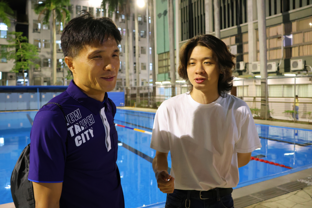 李珈睿 (下圖右) 設計陪跑帶,葉思妤 (上圖左) 設計陪泳帶。思妤與視障鐵人阿興共同游泳實測後,重新調整裝備,以供阿興參賽使用。(圖|Trista)