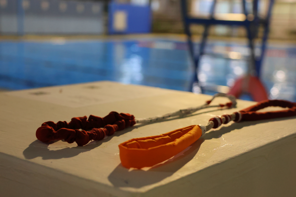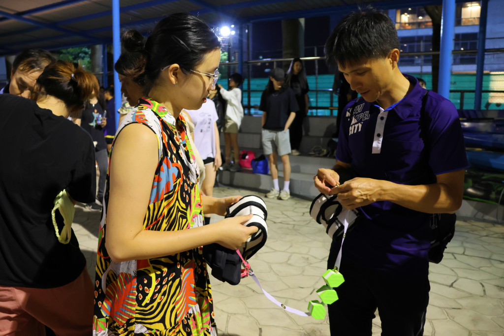 雖然今年的選課人數不過是去年的一半,但仍有 6 條陪泳帶與 17 條陪跑帶展示在游泳池畔,創作能量反倒更為強盛。學期之初原面臨人數不足的危機,謝老師很感謝最後在繁忙的課業下還願意選擇這門課的每一位學生,因為他們得花上許多時間去了解視障選手的需求,且親身擔任陪泳/跑員,雙方一起反覆檢視設計成果。