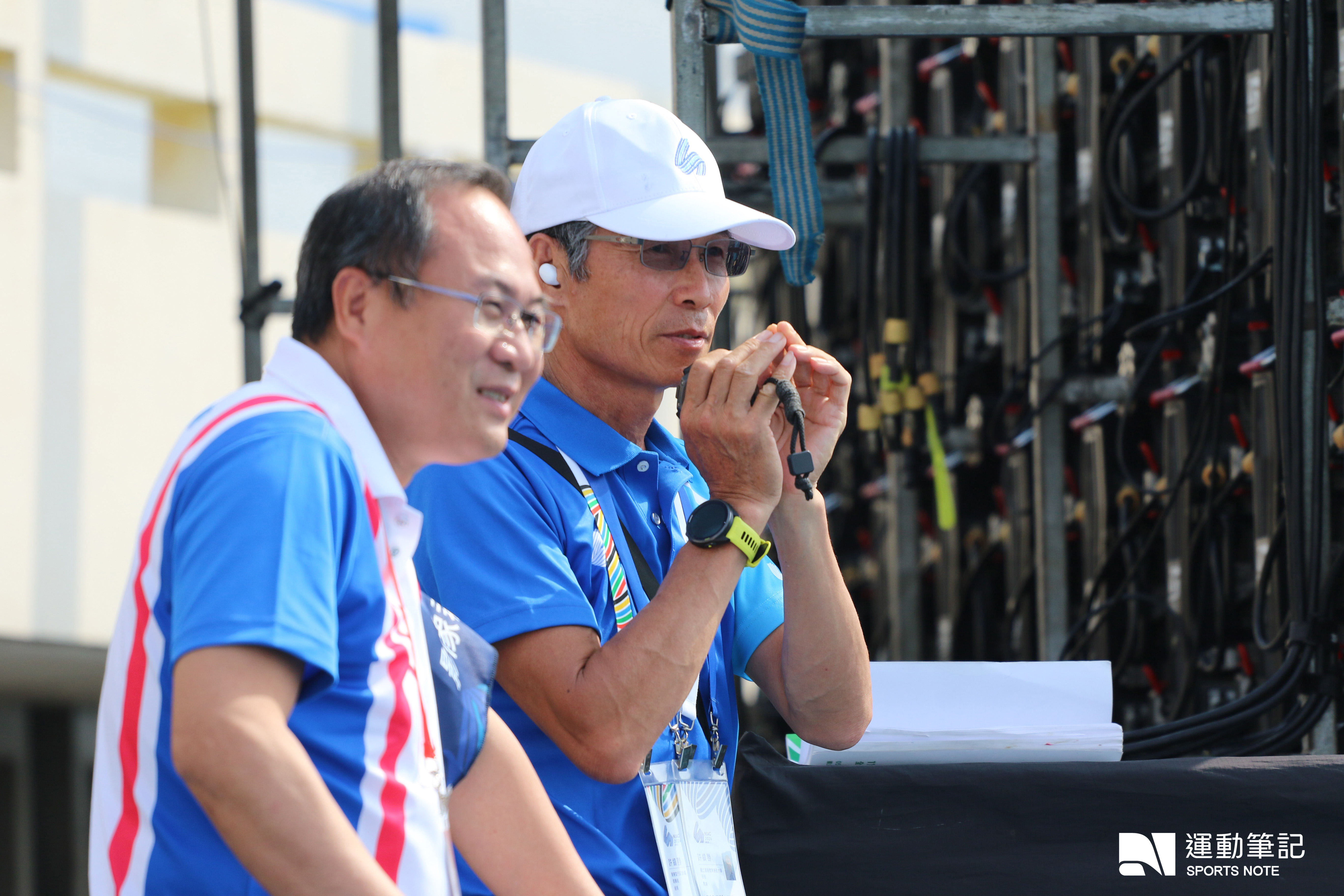 許績勝教練(右)在場邊指導,左為臺灣首位國際A級賽道丈量員-趙子文老師。圖|運動筆記 Ian 攝影