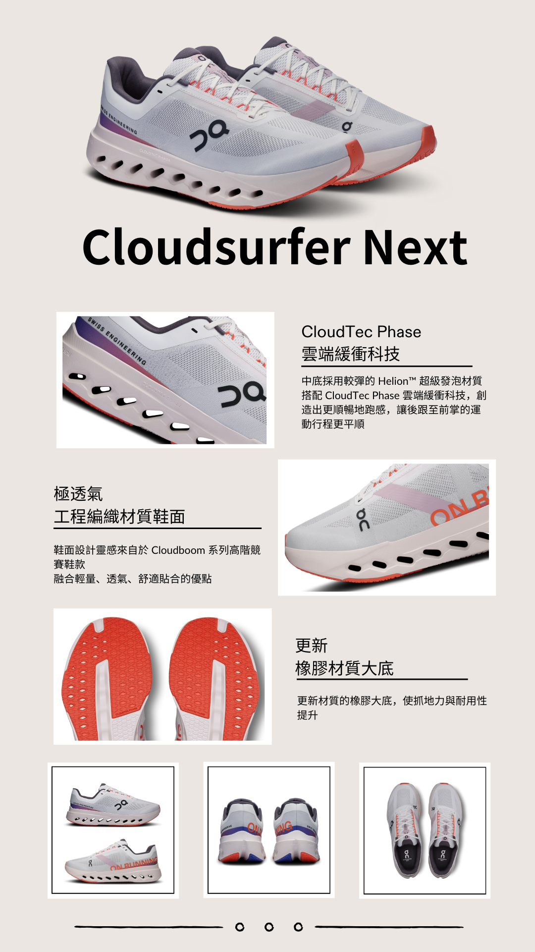 On Cloudsurfer Next 中底採用透過電腦演算的 CloudTec Phase® 雲端緩衝技術,創造出更順暢地跑感,讓後跟至前掌的運動行程更平順;中底採用較彈的 Helion™ 超級發泡材質,讓每一步都能帶來更回彈、更有活力的跑感以及更卓越緩震效果。另外,在前腳掌的弧形設計更進一步增加推進力,讓你每步都能迅速有力且輕盈流暢,感受更快、更敏感的腳感。