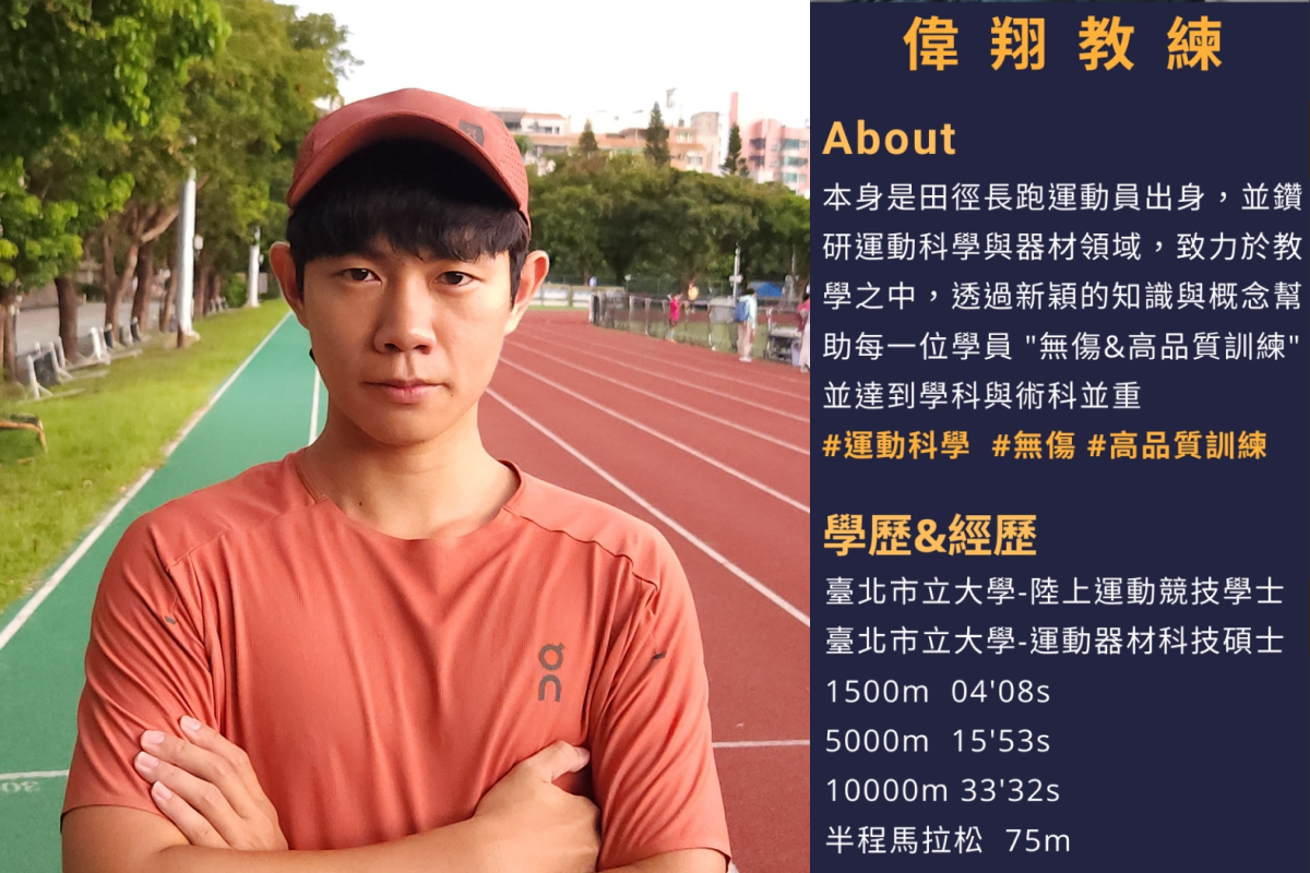 本次訓練營邀請到知名教練洪偉翔擔任訓練營總教練。田徑選手出生的偉翔教練,為了將跑步的專業知識推廣給更多跑友,創辨自己的跑班品牌—翔與你跑,同時也身兼企業、森林跑站等跑班教練,具有豐富的實際教學經驗。
