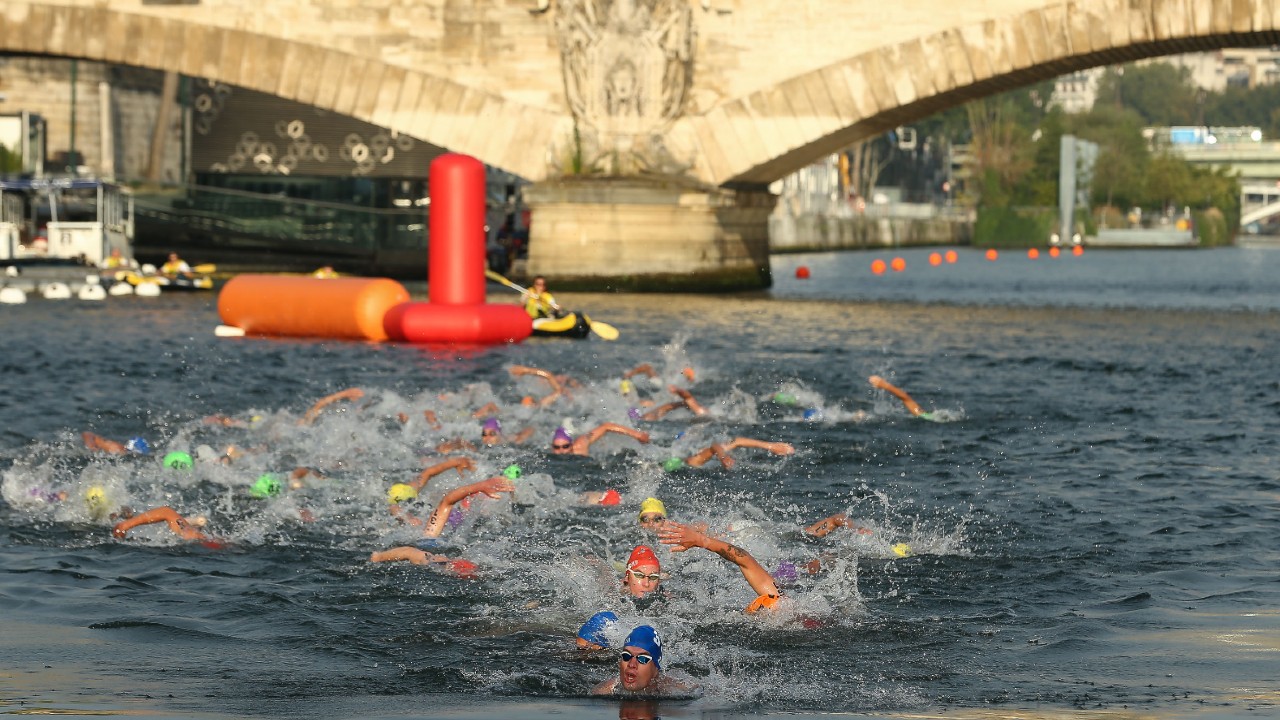 在 2023 年 8 月,鐵人三項運動員在巴黎奧運測試賽期間在塞納河中游泳。