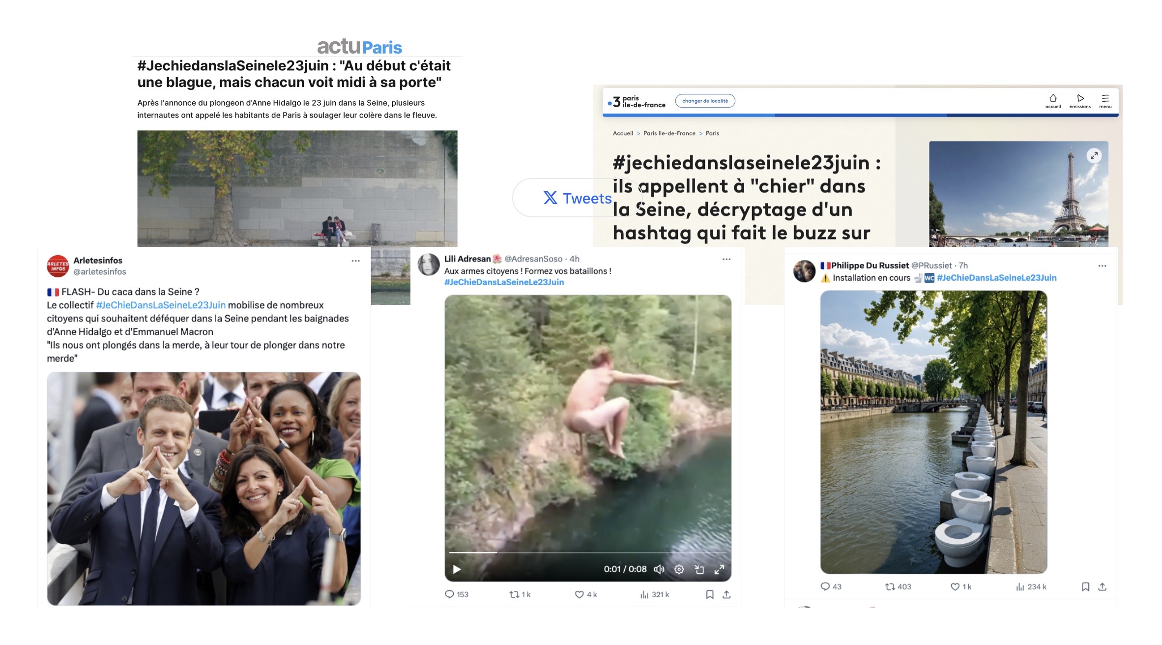 有一群人在社群網站上發出 # JeChieDansLaSeineLe23Juin 的標籤,意思是「我在6月23日於塞納河大便」,抗議巴黎政府舉辦奧運勞民傷財,後來更有人設置網站,其中包括提供計算工具,讓網友知道從自己住的地方要在什麼時候做,糞便才可以在23日中午(臺灣時間23日下午18時)在塞納河中飄到巴黎市中心,不過,到目前為止皆沒有看到實際行動。