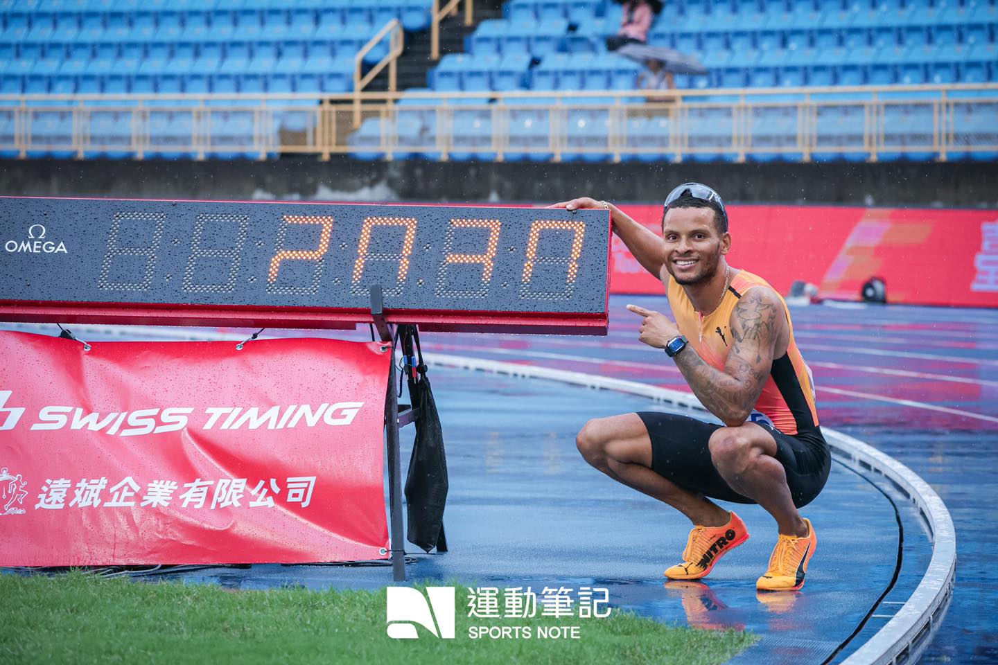 東京奧運金牌 Andre De Grasse 於臺灣田徑公開賽公開獻技。( 圖 / Chun )