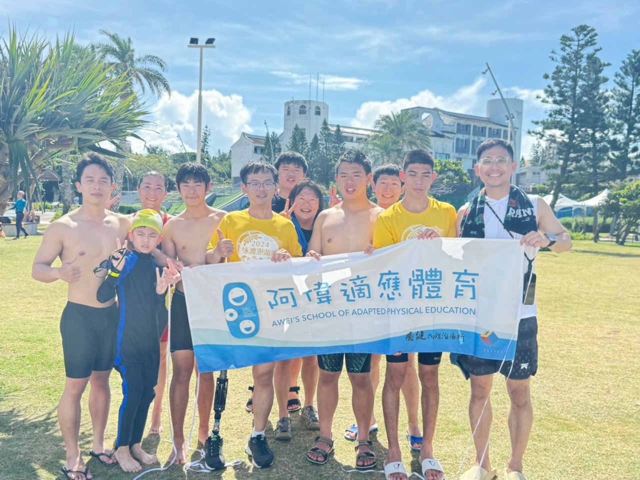 成立阿偉適應體育的詹聖偉這次也有帶著不同障別的學員們前來挑戰泳渡澎湖灣,在出發前也分別為他們定下了不同的目標,「我們有 3 個小朋友入選了世界中等學校運動會的中華代表隊,希望讓他們可以在這次比賽中來拼一下速度試試看,所以我們這次就分成了 ABC 三組。 A 組就是我們的奪標組,希望可以衝一下成績,那當然成果也非常好,即使今天浪稍微大一點,他們也順利完成了,大概在前四分之一的排名,我相信大家可能 PR 也超過九十,蠻快的。那 B 組就是他已經會了,但是當然還沒有學長姐這麼快。C 組就是需要一些爸爸、媽媽、助理老師來協助的一組,等於是比較休閒的方式把它游完。」阿偉說道,「當然,視障的同學們有綁陪游繩,用這種方式的還有智能障礙的孩子,我們事前有做一些定向的訓練來幫助他們。」