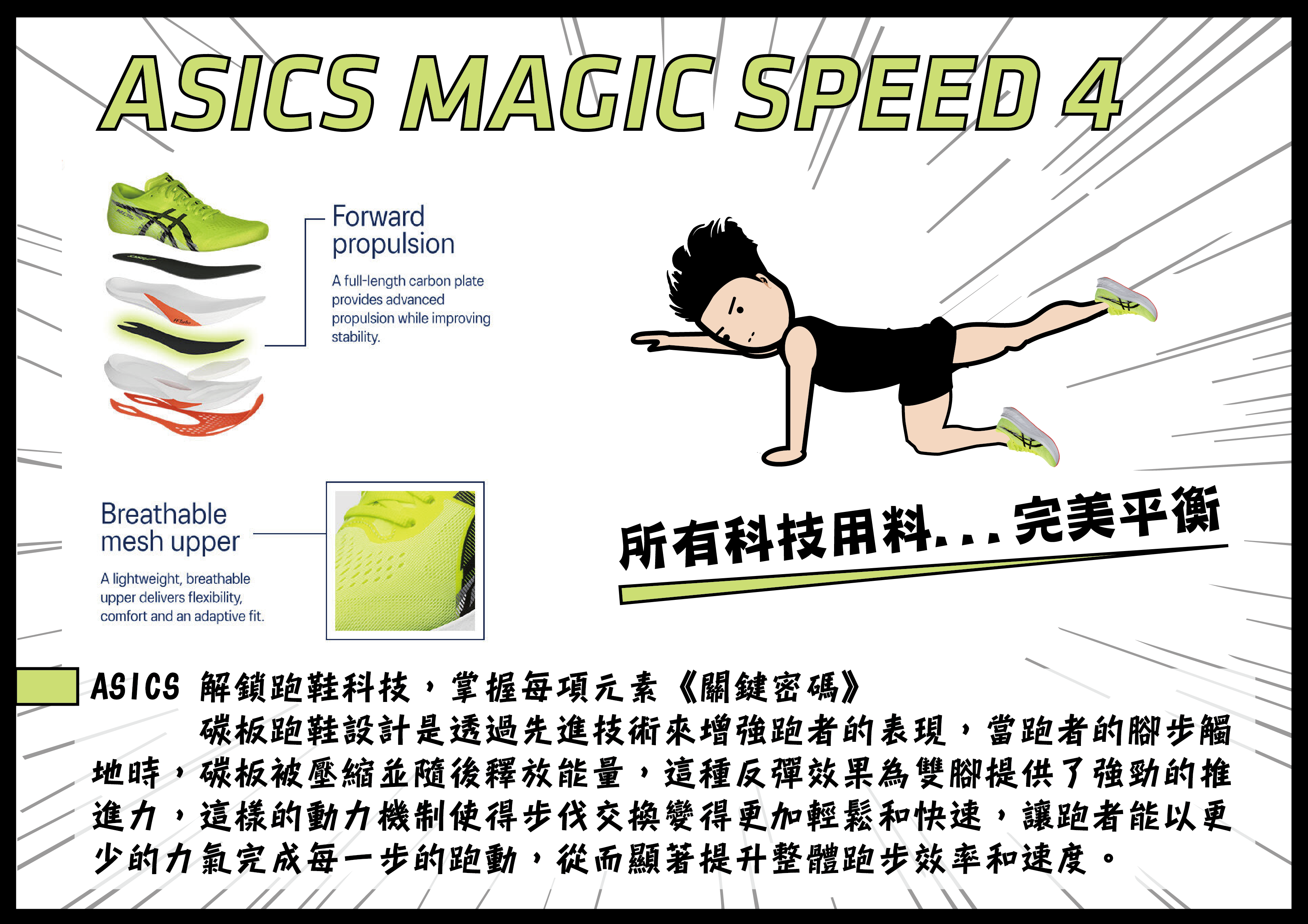 如果你長期有跑步習慣,想要找尋一雙能日常訓練又能比賽的跑鞋,MAGIC SPEED 4 絕對會是你的選擇之一,它是一雙適合全民跑者都能穿上的碳板跑鞋,ASICS 可說完整解鎖跑鞋科技,掌握跑鞋科技每項元素關鍵密碼,MAGIC SPEED 4 這次改良細節非常豐富,從鞋面優化成工程網布、中底增厚、前掌範圍擴增、碳板改良、大底點狀顆粒等,整體設計給予更全方位支持,穩定、緩震、舒適是跑鞋的金三角,MAGIC SPEED 4 在這三項指標皆提升至更高水平,整體滾動性升級,跑動自然前傾的幅度更為輕鬆,比起過去更好駕馭。