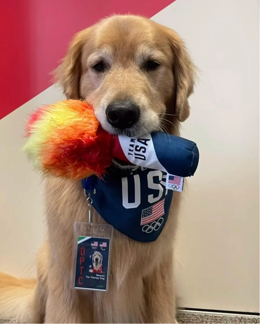 Beacon 出現在今年的美國奧運選拔會上,搖著尾巴入場的樣子不僅療癒了選手們的緊張心情,也贏得了數百萬網友的喜愛。他的訓練師 Tracey 表示:「牠有一種與生俱來的能力,就是可以感知人們的壓力,並且舒緩他們的情緒。Beacon 對選手來說就像是一塊情感海綿,一起慶祝快樂的事物,也一起為選手遇到的挑戰提供支持。」