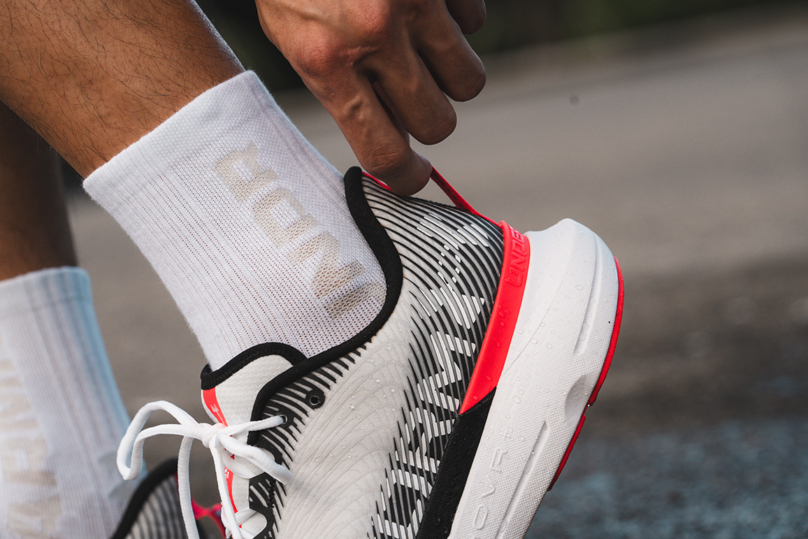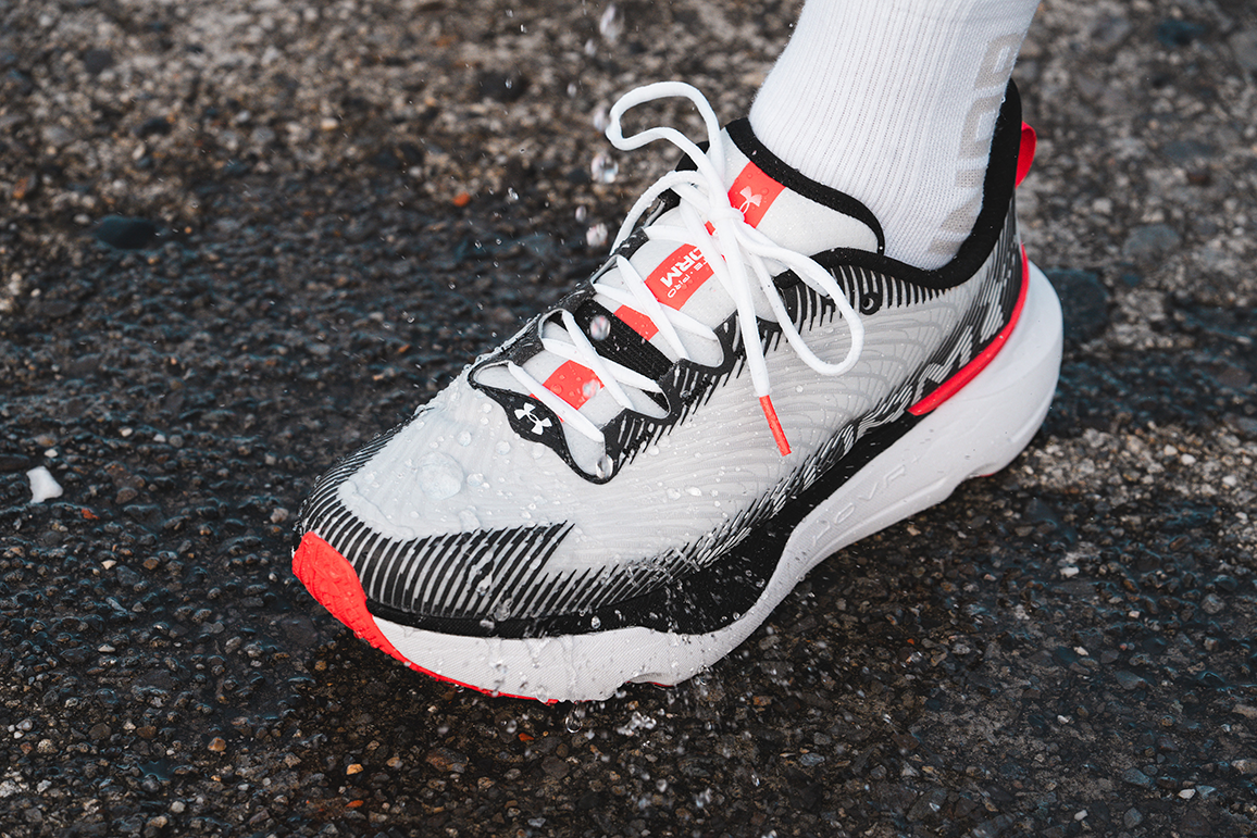 UA Infinite Pro Storm 鞋面提供防潑水和透氣設計,讓跑者在風雨中也能舒適自信地訓練。(照片來源:Daniel )