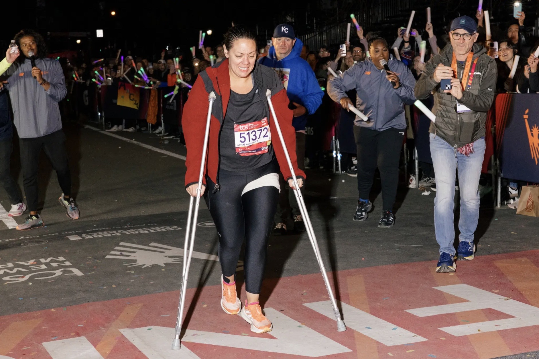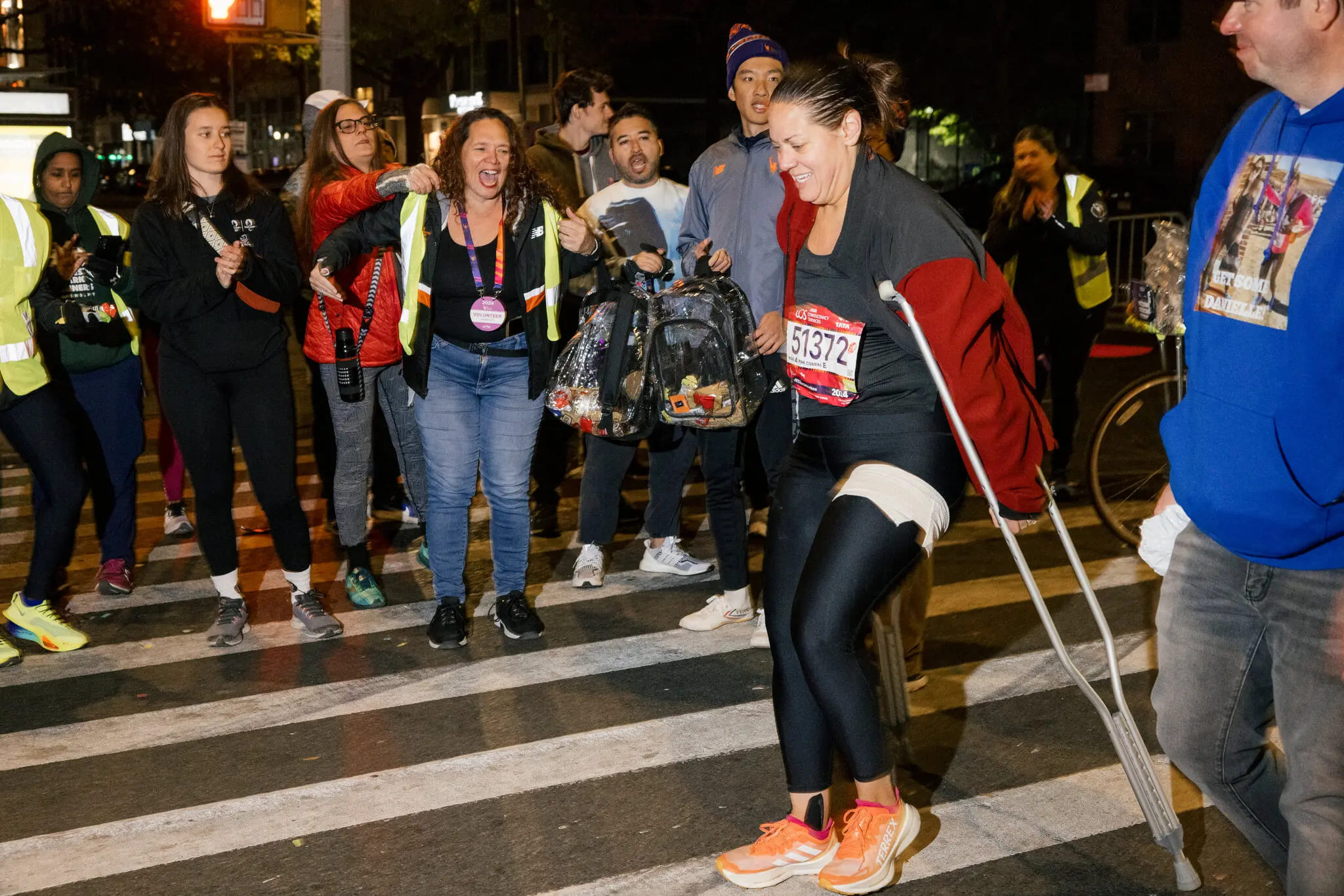 在週日清晨,當紐約馬拉松的首批跑者衝出起跑線後,經過了超過十個小時的艱難賽程,直到日落西沉,最後兩位跑者終於踏過馬拉松的終點線。此時,一位跑者憑藉著自己的雙腳配上一副拐杖,完成了這場充滿挑戰的紐約馬拉松。