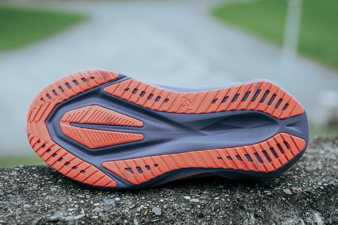 但在這種速度下 FF BLAST MAX 中底踩起來扎實,但卻不厚重,讓我每步踩踏都非常輕快,不會感到拖泥帶水,蹦床式的大底設計擁有非常好的滾動性及推進感,可以很輕鬆地維持速度,AHAR LOW 橡膠大底更是在雨天有足夠的抓地力,讓踩下的每一步都會很有信心,不怕濕滑。