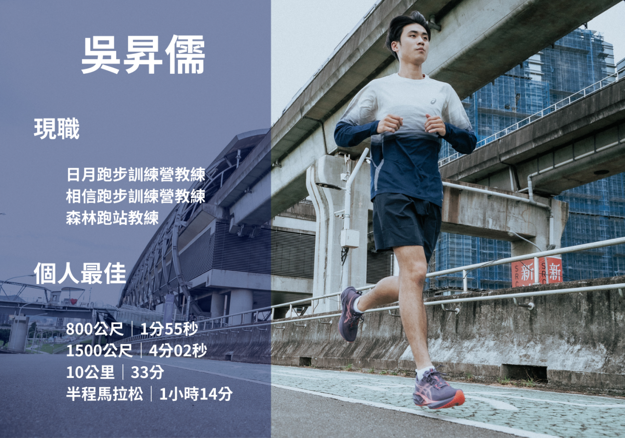 大家好我是吳昇儒,目前跑齡 16 年,跑班教學經歷 6 年,除了自己創立的「日月跑步訓練營」之外同時也是「相信跑步訓練營」及「森林跑站」的教練,今年也即將前往富士山馬拉松挑戰初馬,希望取得首爾馬 A 區的成績資格,並以明年首爾馬拉松當作目標賽事,目標完賽時間 2 小時 40 分。