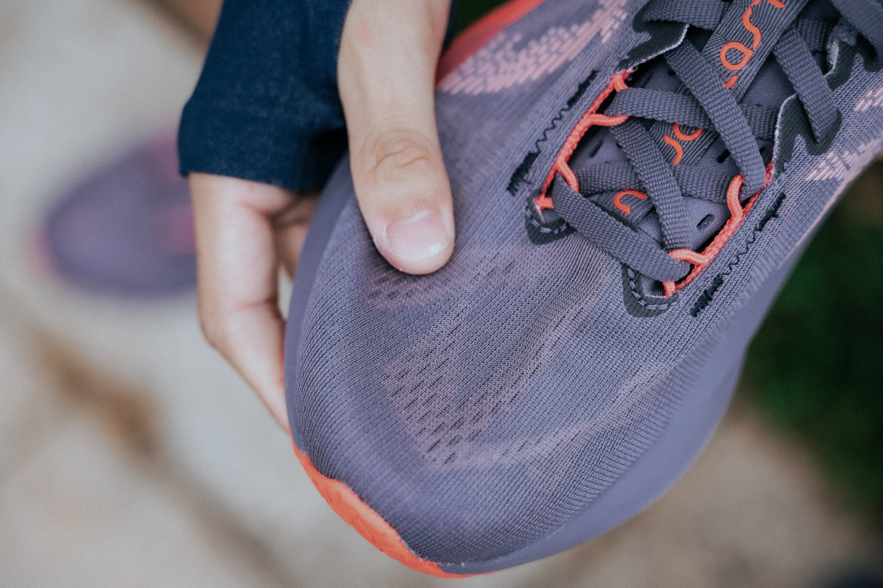 這次的鞋面部分升級為輕量工程緹花網布,跟上一代相比布面材料肉眼可見的更加輕薄,透氣孔更多,讓整體透氣性更加提升,但卻不失它的包覆性與耐用性。在跑步時腳掌會因為血液循環增加的關係而比平常更腫脹,輕薄的工程緹花網布面可以讓腳掌有更多的緩衝空間,避免跑步中後段因為腳的腫脹而感到不適,也因布面更輕薄、透氣性增加,可以讓雨天跑步時減少布面吸水增重的情況並加快水分揮發的速度。