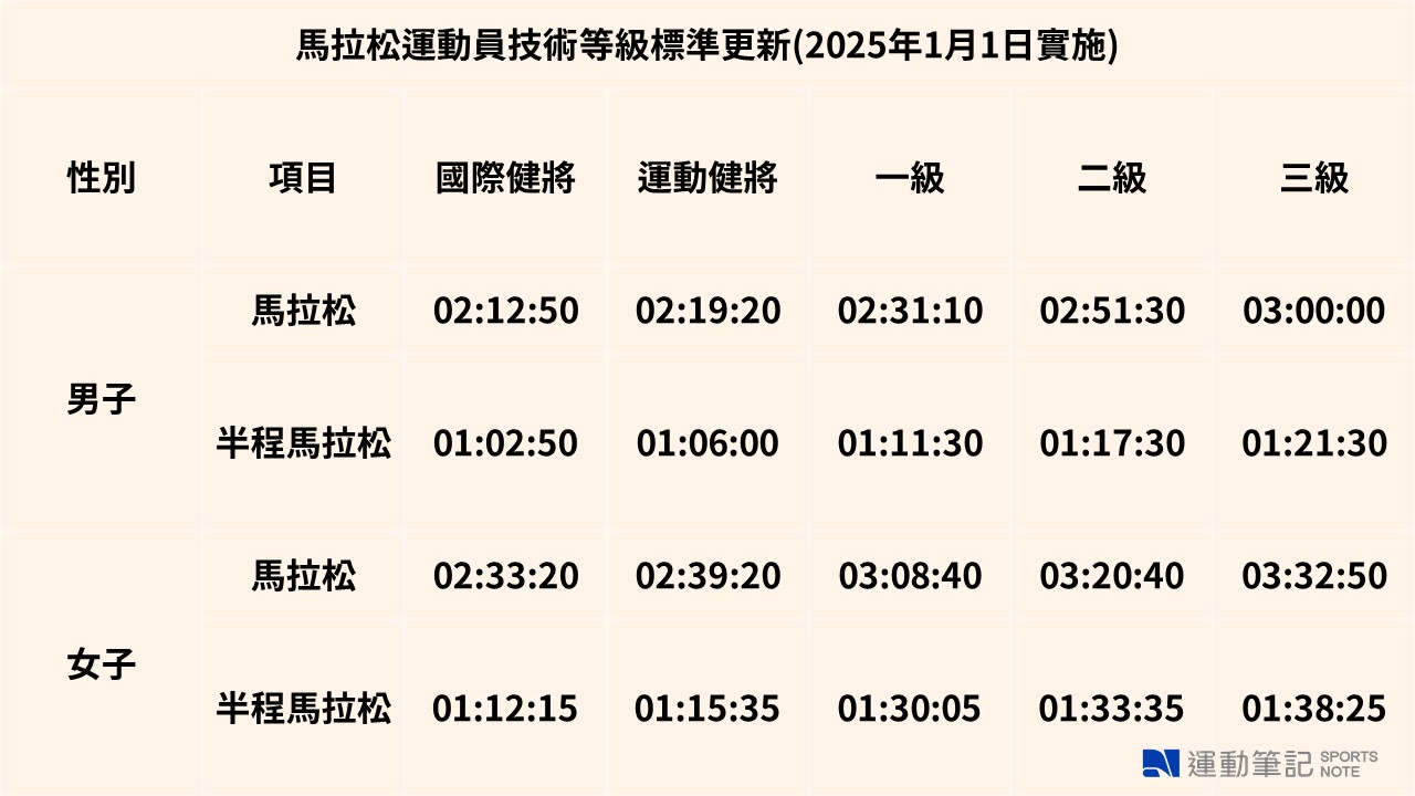 隨著跑步運動在華人地區的風潮愈來愈盛,中國體育總局近期公佈了2025年全新的《運動員技術等級標準》,將於明年1月1日上路!這次修訂不僅提升了不同級別的門檻,也顯示了中國跑者在馬拉松項目中的整體成績的提升。如果你是愛跑者,不妨來看看自己在哪一級吧!