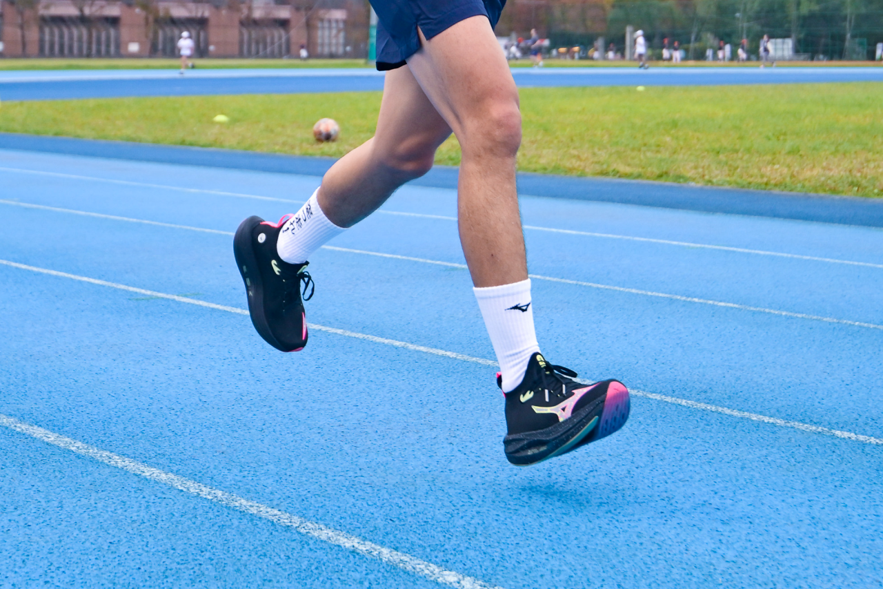 彥翔分享過去在田徑隊也都是穿 MIZUNO 跑鞋,只是當時的鞋底很薄,再度穿上經驗於柔軟的腳感,且鞋底外觀雖厚卻不會重,「對於軟的印象是不穩定、可能會很晃,但實際穿起來卻有足夠的支撐度。」