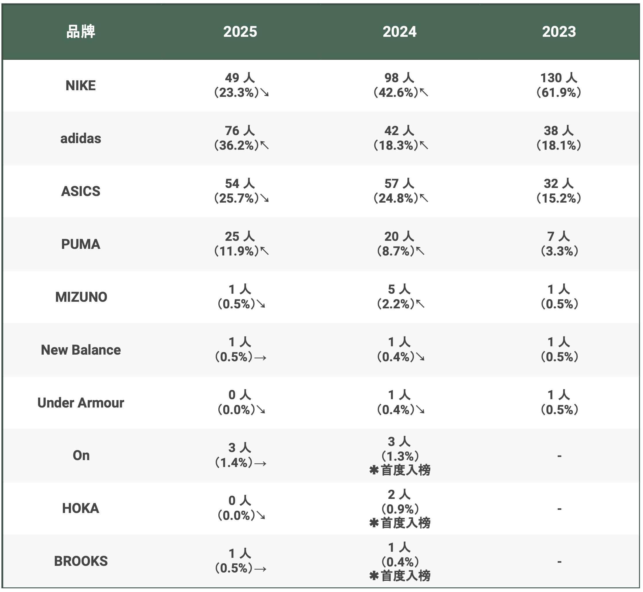 令人關注的是, PUMA 今年共有 25 人穿著,從去年的 8.7% 上升至 11.9%,逐漸在箱根駅伝站穩一席之位。其他品牌的變動幅度則相對較小。