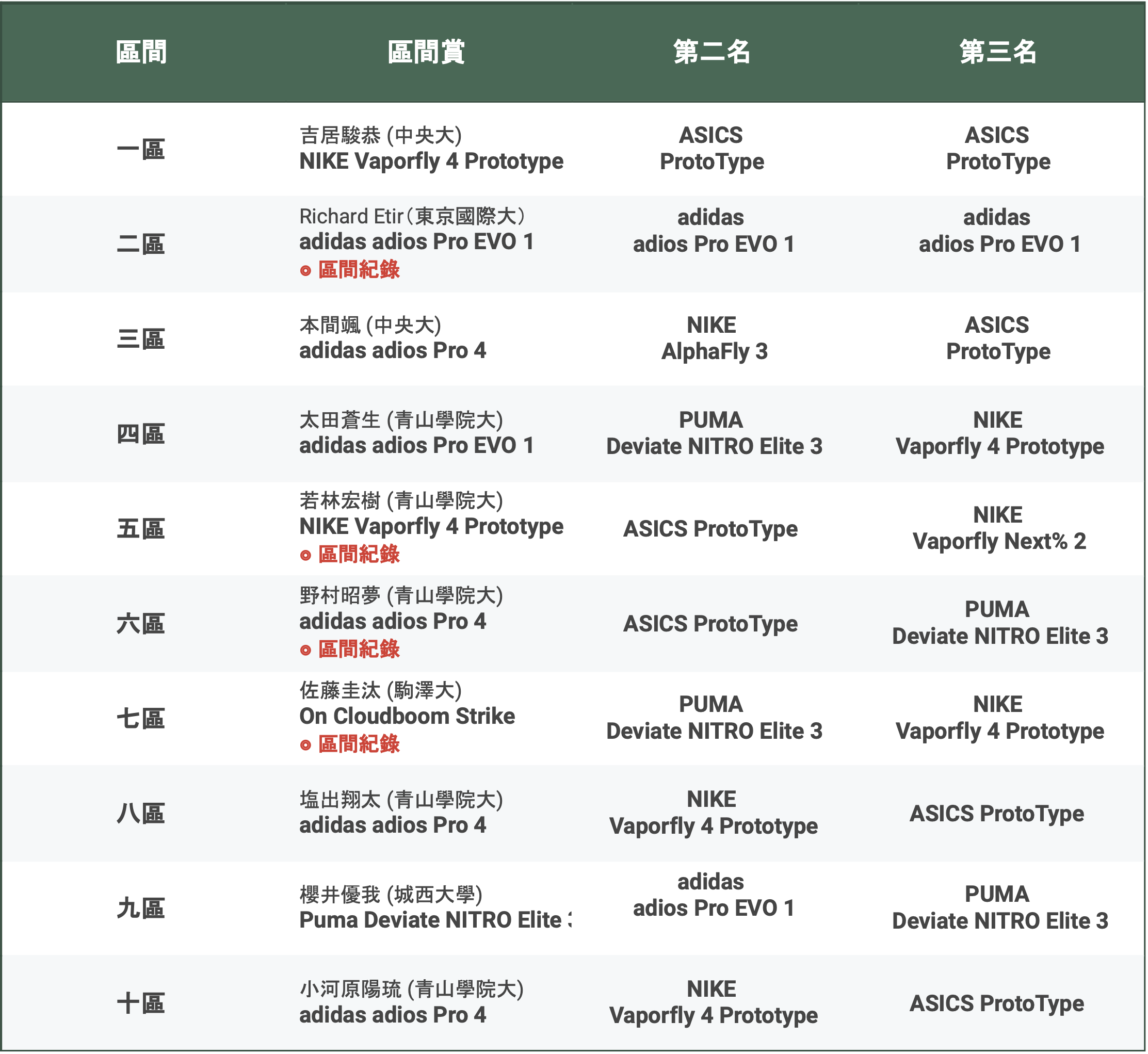 各區前三名的品牌計數,以 adidas 的 9 雙獲得冠軍,共計有 5 雙 adios Pro 4、4 雙 adios Pro Evo 1,Nike 則與 ASICS 以 7 雙並列第二,另外可以看到這之中仍有選手選擇了較早的款式:VaporFly Next% 2;PUMA 則以 5 雙緊追在後,選手們大多選擇了 Deviate NITRO Elite 3 而非 FAST-R NITRO Elite 2。