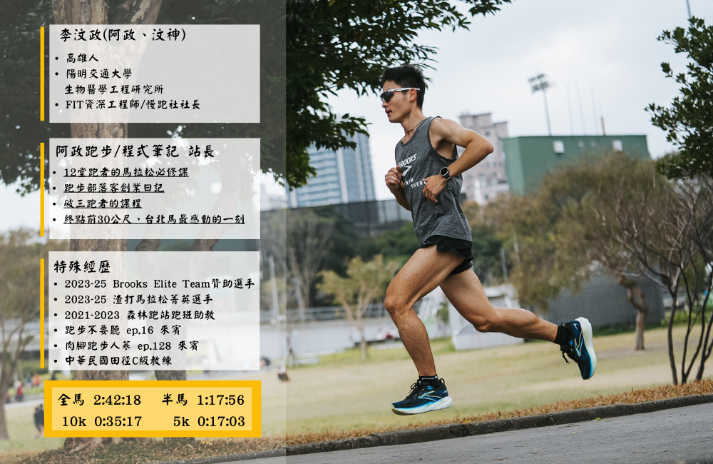 哈囉,大家好,我是阿政,不少跑者也會稱呼我為「汶神」。真的很感謝大家對我的美稱,讓我在跑步的路上更珍惜跟跑者們的互動與連結。我更喜歡跑者叫我阿政,因為阿政聽起來比較親民一些!