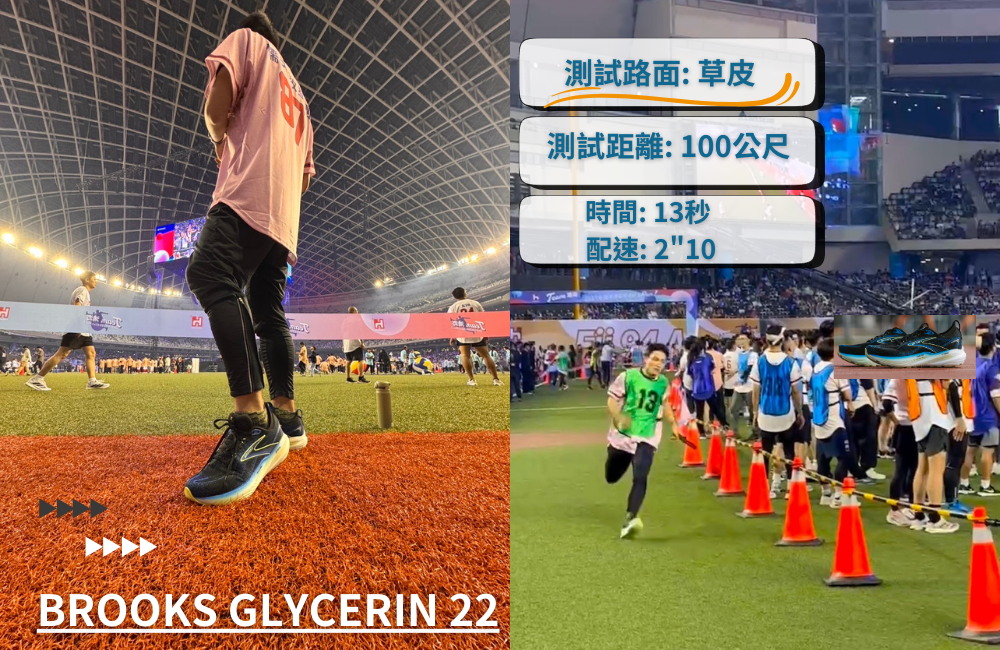 收到 BROOKS GLYCERIN 22 隔幾天就是公司的運動會大隊接力,我迫不急待地穿去大巨蛋,讓新鞋亮相,很酷的是,我可以說這應該是第一雙踏上大巨蛋草皮的 GLYCERIN 22!在短短 13-14 秒的全力衝刺過程中,我想起了無數的訓練時光,與當下穿在雙腳的強力夥伴。最有感的是,跑起來不會打滑,即使在草地路面上全力奔馳,也是穩穩的往前進;在跑快時,給予你強力的推蹬回饋。也因為鞋子整體的包覆性、跟上腳奔馳的感受,讓整體滿分 10 分的體驗上,我可以給到 9.5 分!