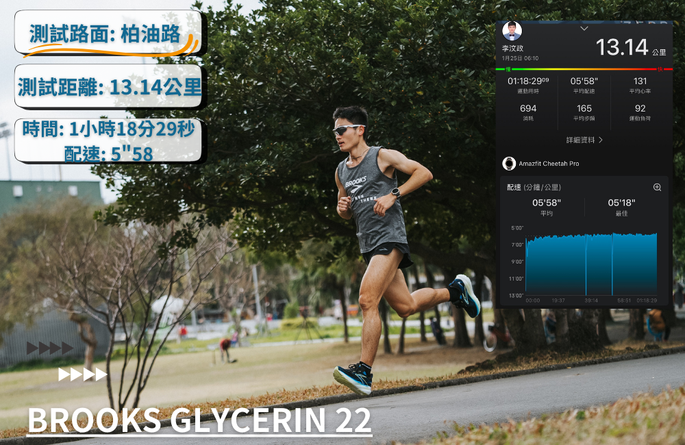 過年期間穿著 GLYCERIN 22 到處陪家人小孩踏青遊玩,里程也默默地突破 200 公里!走到哪裡就穿到哪,不僅在穿搭上有型、在訓練上也有很大的幫助。我會把這雙鞋子定義在平常訓練用鞋,正如官方所定義的長距離與速度訓練上都非常合適。誠摯推薦 BROOKS GLYCERIN 22 給所有跑步愛好者,讓他成為你的訓練夥伴吧!他是一雙可以陪伴我們累積實力,幫助你快慢收放自如,在有趣的跑步旅程中露出莞爾微笑的最佳利器。