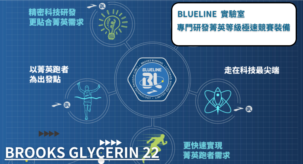 藍線實驗室的名稱由來也很特別,BLUELINE 是指科技研究在實驗室階段所優先繪出的結構藍圖;是 BLUEPRINT(藍晒圖)上面的藍色線條。BROOKS BLUELINE 實驗室等級產品線,如同所有高端科技產品的研究發展一樣,精密與審慎,充滿科學數據,是由生物力學家與菁英跑者並肩合作,共同開發的創新科技;最有趣的是馬拉松最高聖堂賽事-波士頓馬拉松沿途的指標,就是藍色線條。BLUELINE實驗室的名稱,就意味著一路領先,只要沿者藍色線條指標前進,就能夠最快抵達終點!