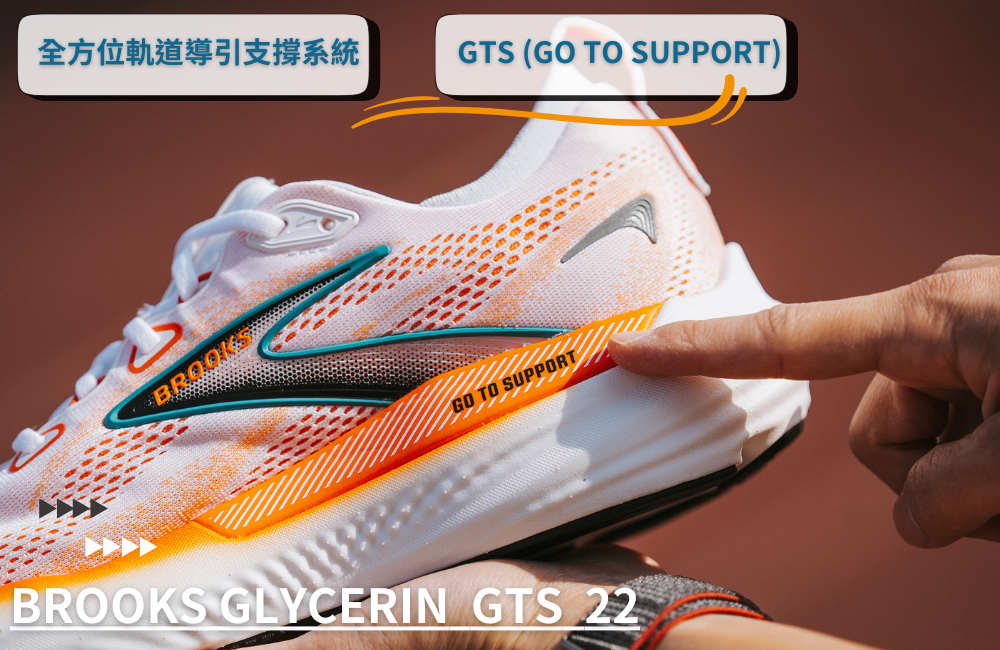 另外有一個很大的福音,是 GLYCERIN 22 的選擇性更多了!針對跑者不同的腳型,男女生皆提供三種楦寛:一般楦、寬楦、超寬楦,並針對低足弓跑者、有內/外旋困擾的跑者,也貼心推出 GTS 款,搭載 GUIDERAILS 全方位軌道導引支撐系統,更具穩定、保護力,可以減少膝蓋與關節的受傷機率。
