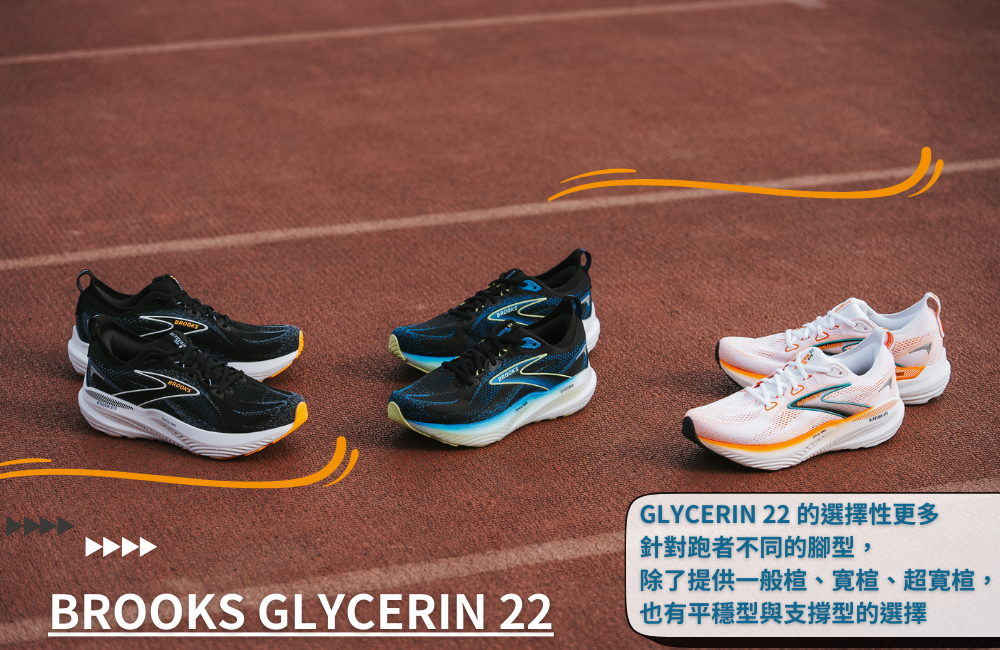 這次也同步推出 GLYCERIN GTS 22 版本,讓跑友們能在更安全有保護的情況下開心練跑,而腳板較寬或較厚的跑友們也不用擔心,GLYCERIN 22 系列皆提供三種楦寛(一般楦、寬楦、超寬楦)可做選擇。