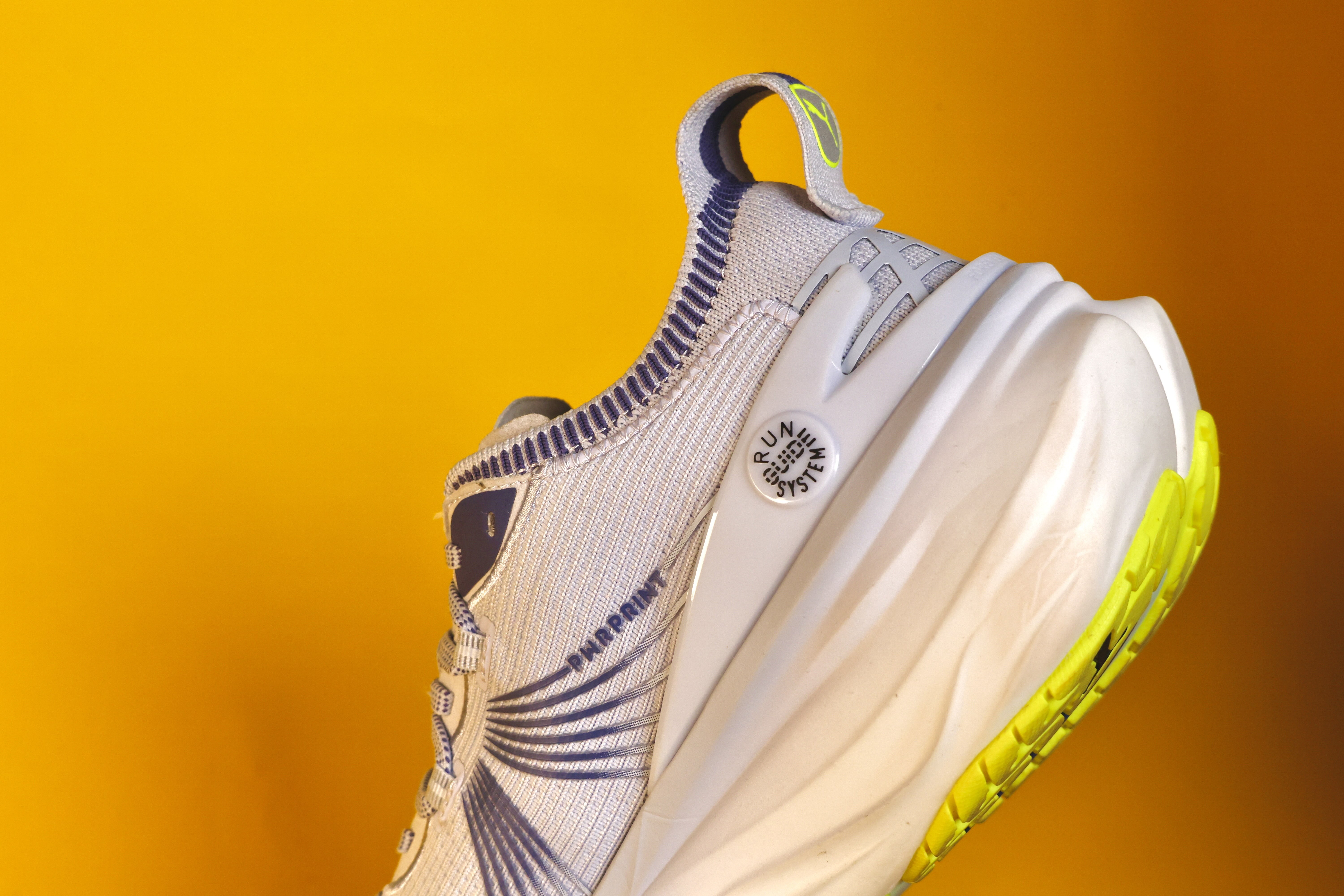 鞋面部分則採用了 ENGINEERED KNIT 工程針織技術,可以給使用者帶來良好的貼合感與透氣性外,具彈性的針織網布,能夠更好的貼合不同的腳型,同時搭配了 PWRPRINT 及 PWRTAPE 技術強化鞋面關鍵區域結構,增加整體穩定性與支撐。後跟部分則搭載了 TPU HEEL SUPPORT 穩定片,能夠提供額外的腳踝鎖定,對於有些輕微內旋的跑者,可以提供在落地時更穩定的效果。