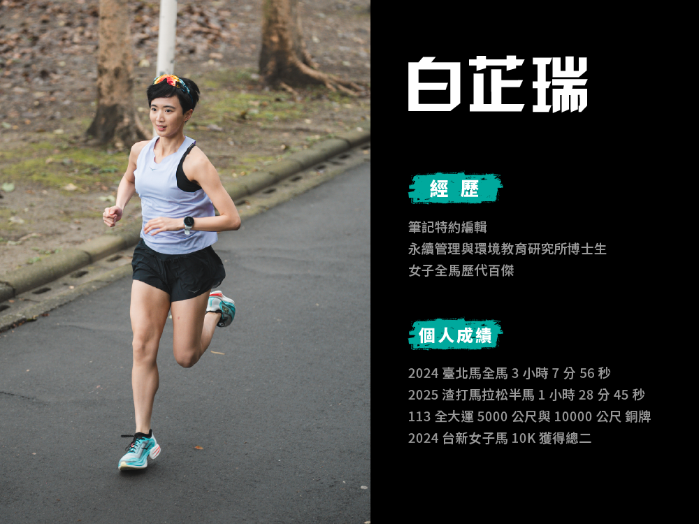 我是白白,永續管理與環境教育研究所博士生,研究領域涵蓋運動管理、賽會贊助、馬拉松與環境保護。曾經,我是芭蕾舞者,因傷離開舞台,卻在跑步中找到了新的節奏,如今已累積近十年跑齡。2024 年,我突破自我,在臺北馬拉松跑出全馬 PB 3 小時 07 分 56 秒,成功擠進女子全馬歷代百傑。