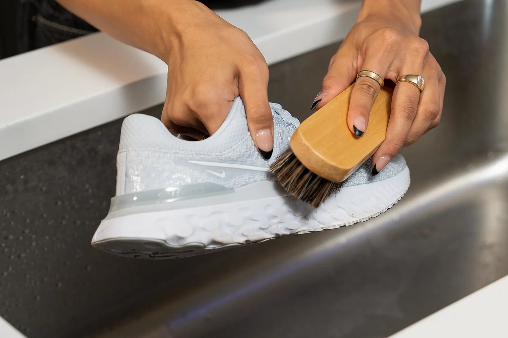 3.將軟毛刷沾取適量中性清潔劑、肥皂水去除鞋面污垢,然後硬毛刷則可以清潔中底及大底的部分。在意小細節的跑者們,還可以使用牙刷來清潔一些比較刁鑽的部分。(注意!無論如何,都不要浸泡你的鞋子,由於跑鞋多是由環保膠黏合,長時間浸泡可能會導致鞋子脫膠。)