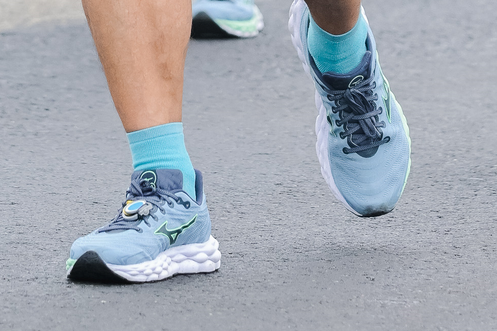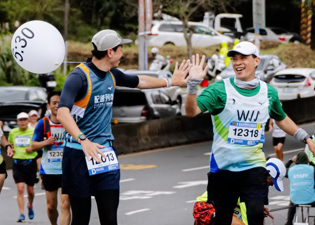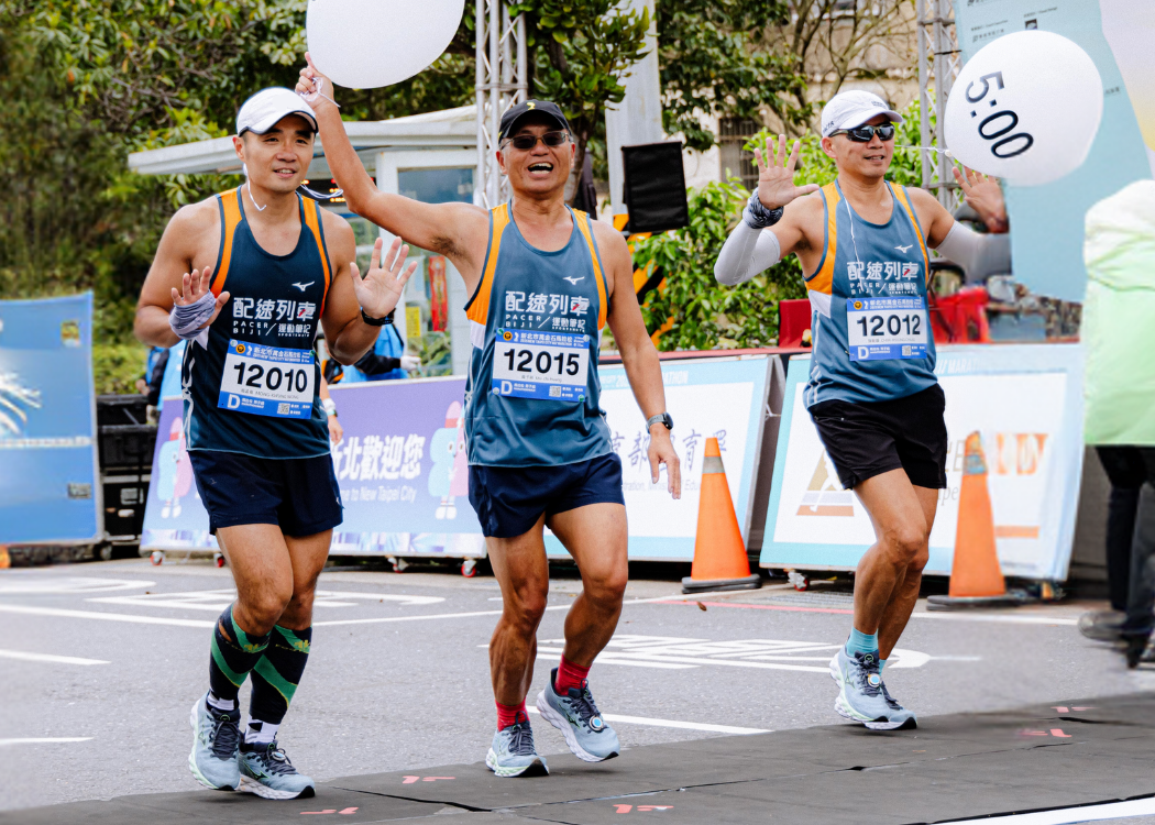 500 至 530 配速列車長穿著 MIZUNO WAVE SKY 8 陪伴跑者迎向終點。 (圖|Benson)