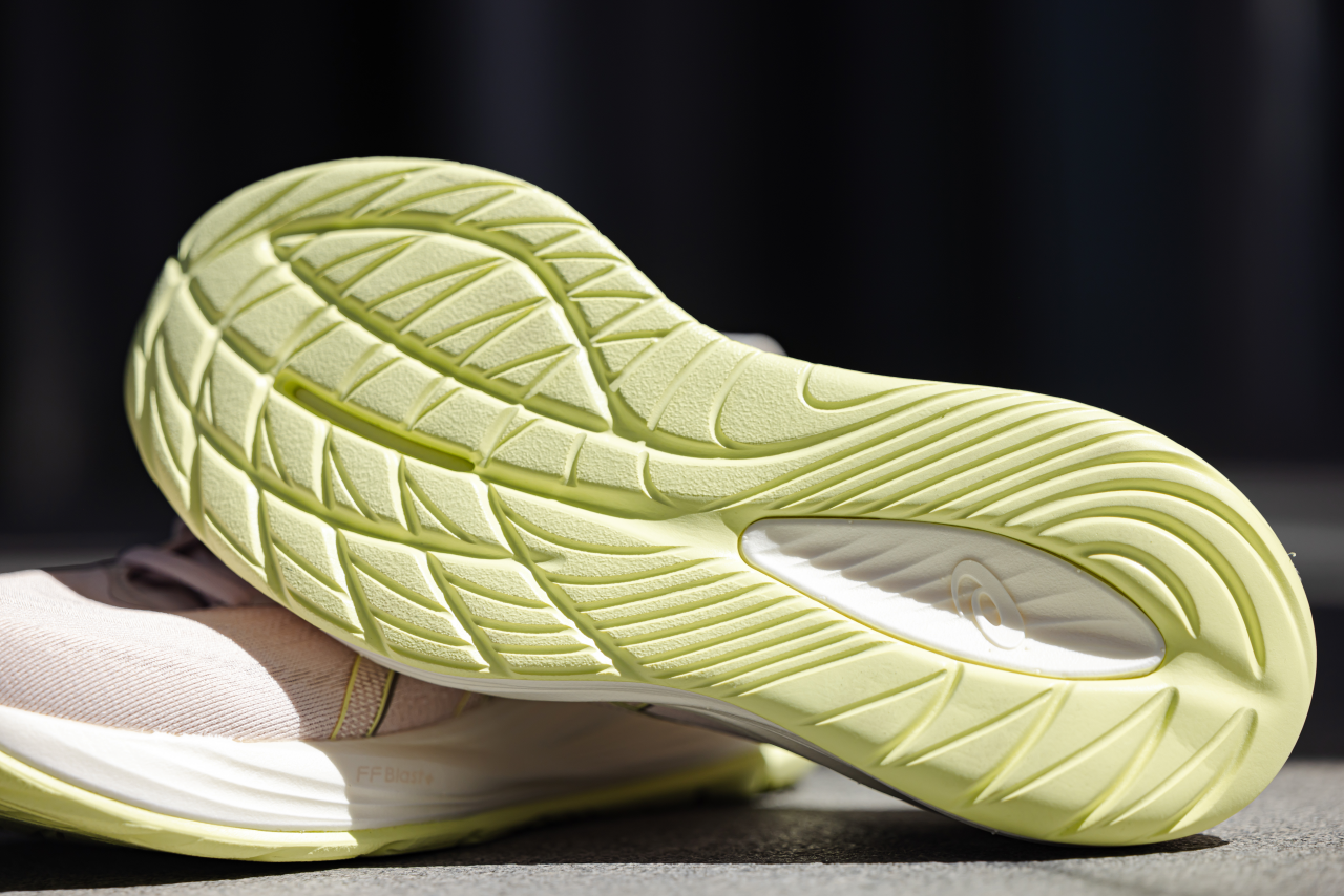鞋跟處使用 PureGEL™ 技術,內置的 PureGEL 亞瑟膠除了保有原亞瑟膠的緩震性能外,重量更輕且柔軟,使鞋跟處的彈性更明顯,能有效緩衝、吸收來自地面的衝擊力。此外,後跟傾斜角度加大,搭配前腳掌結構,提升觸地推蹬的流暢度。財委對 Sara 所言抓地力的提升很有同感,認為這雙鞋後腳底的平衡效果也很好,不會出現因鞋底厚度造成過彎不順、或外側腳要多出力的情況,能夠很輕盈的轉彎或暫停,腳感十分舒服;且腳底的軟 Q 感非常明顯,也因此很適合在輕鬆跑時穿著,讓腳可以放鬆,日常走路也很舒適。
