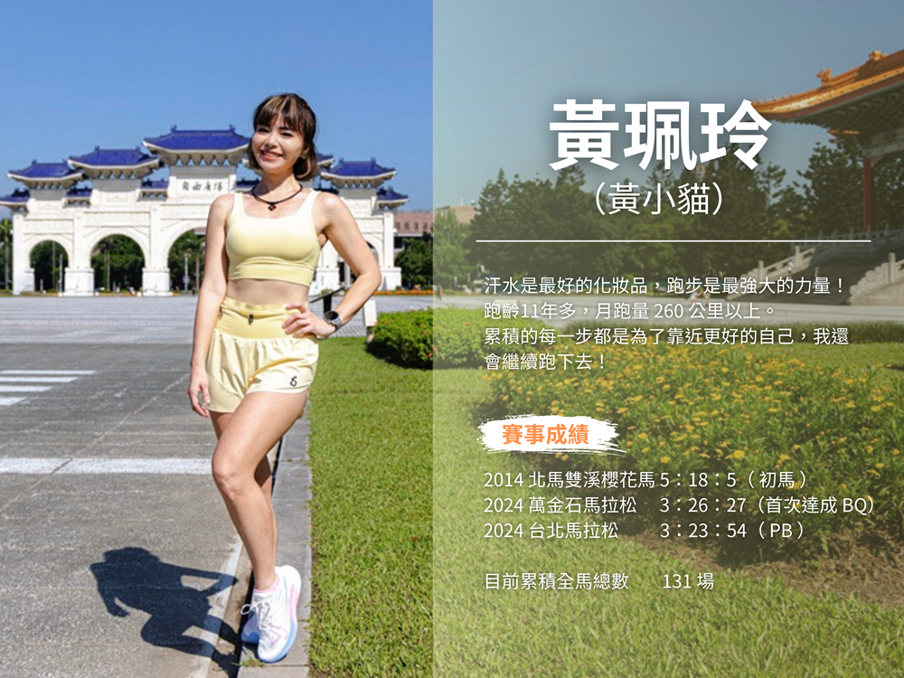 曾經我對跑步一無所知,雖然習慣健身房的重訓與有氧課程,卻從未想過自己會與「全馬」產生任何關聯。當時的我,只是單純想靠運動改善體態,便從 6 公里開始練起,接著是 10 公里、21 公里,然後直接挑戰 2014 年人生首場全程馬拉松。還記得那次初馬,裝備材質厚重、排水性也差,但我依舊滿腔熱血、汗水雨水交織奔跑,留下了相當「壯烈」且深刻的印象。11 年來,目前已達成 131 場全程馬拉松,雖然比賽經驗豐富,每一次賽事上都還是擁有嶄新的課題,讓我的跑馬人生,充滿未知的挑戰。