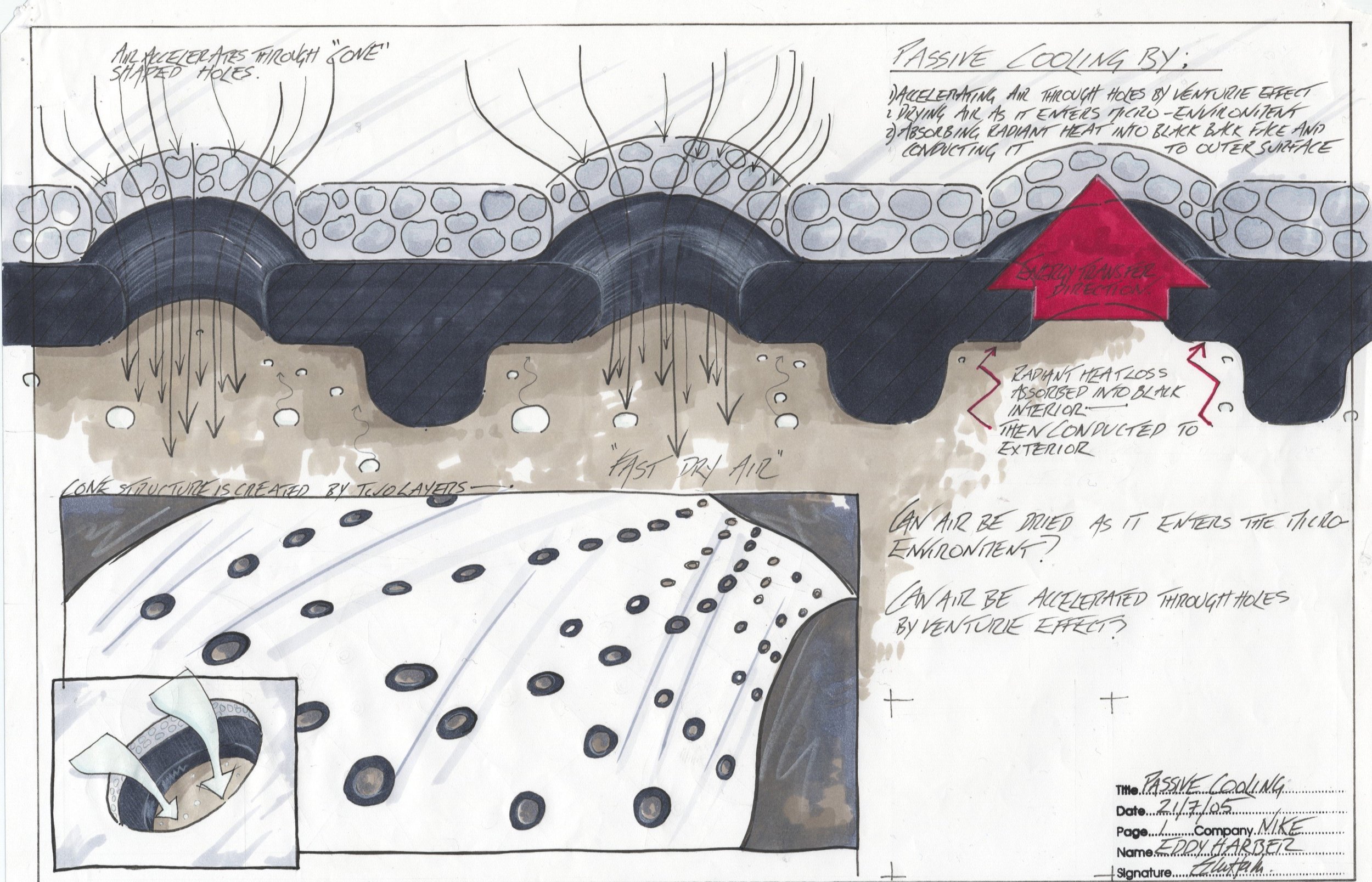 從照片來看,這件服飾很類似於過去 Nike 所製作一種名為 Stand-Off 的特殊布料,該布料曾用於 2000 年雪梨奧運馬拉松選手身上,而這款布料具有能讓空氣流通、透過大孔設計促進汗水蒸發,並利用人體冷卻機制降低溫度,另外該服飾的錐形孔透過「文丘里效應」,可以增強通風帶走熱量。