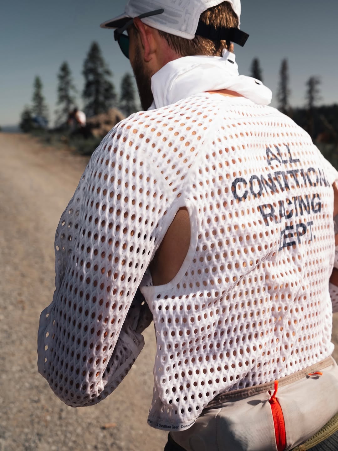 Caleb Olson 穿著一件像是「毛衣」的白色上衣,外觀看起來像是某種機能網眼材質,佈滿網眼孔洞、腋下與手臂部分幾乎全開,衣服正面印有 Nike ACG 標誌,背面則寫著「All Conditions Racing Dept.」(全天候賽跑部門)。
