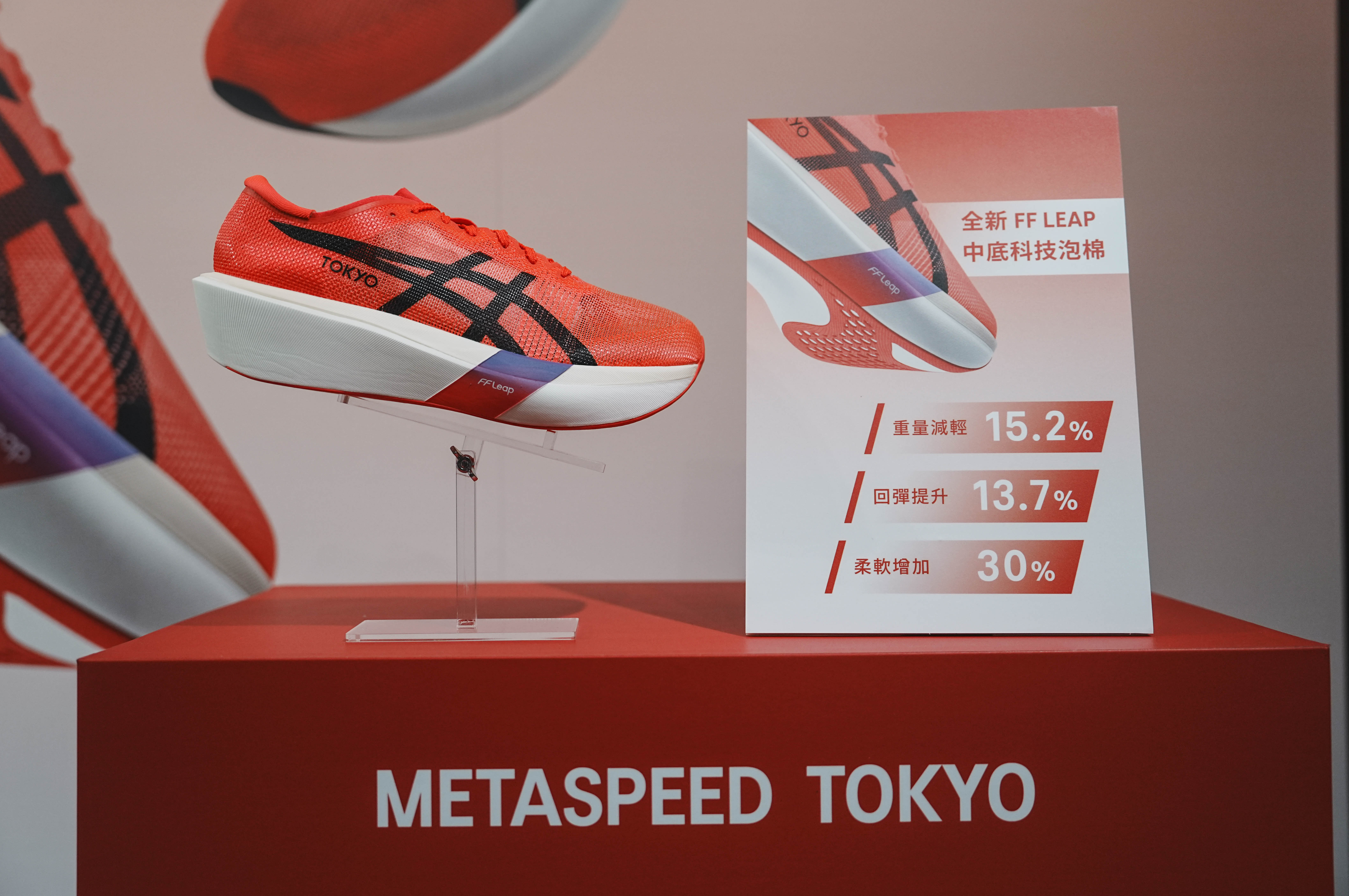 本次 METASPEED TOKYO 系列中包含 SKY、EDGE 兩款,針對步幅型、步頻型的跑者所設計。鞋款搭載了全新 FF Leap™ 與前代 FF Turbo Plus 相比輕 15.2%、回彈力提升13.7%、柔軟度增加 30%,配合這次 Motion Wrap 3.0 鞋面,結合碳板,提供跑者超強的推進與穩定性。