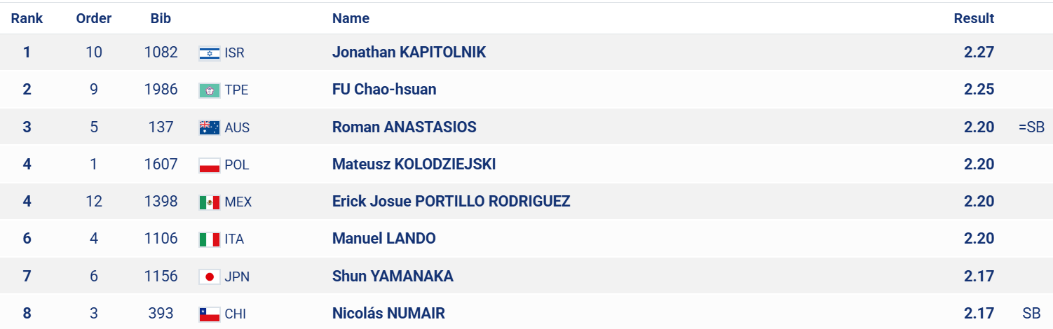而整場一直保守戰術的以色列選手 Kapitolnik,最後則精準發動攻勢,一口氣跳過2公尺27成功逆轉奪金。