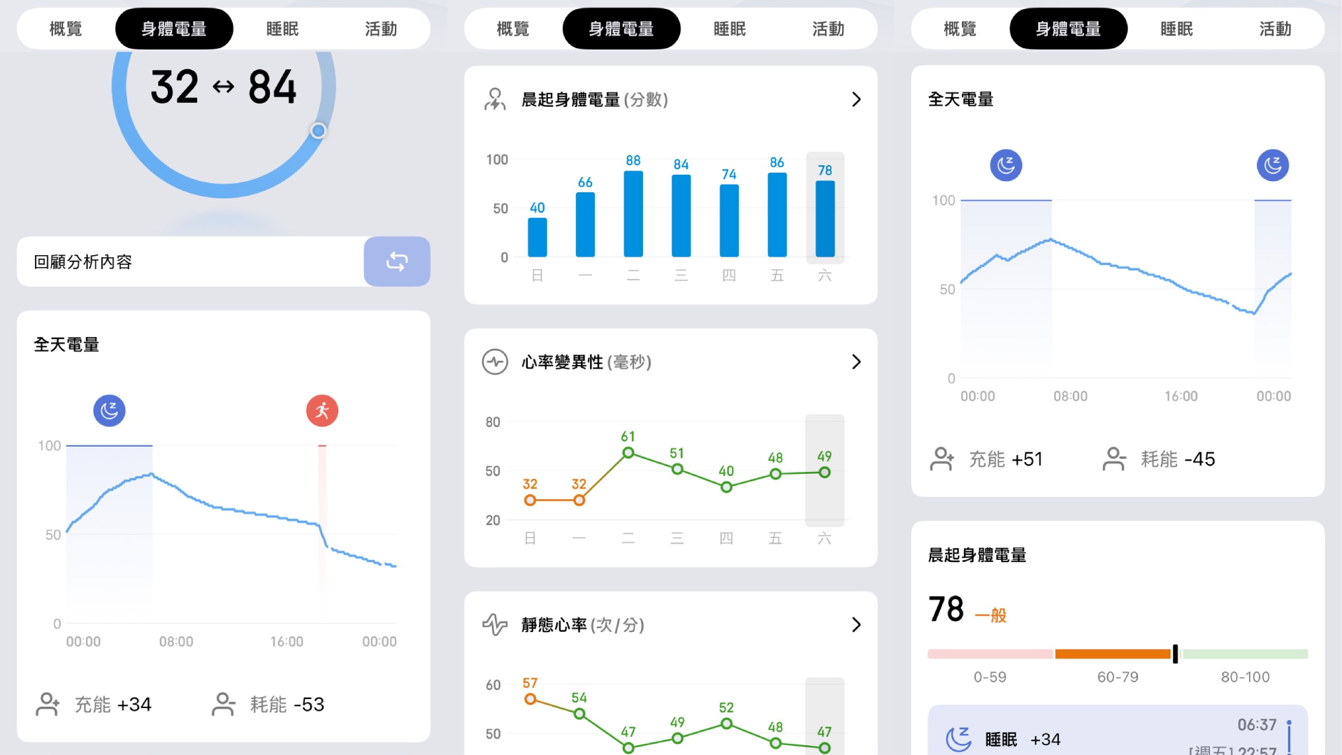 - 身體電量評估:綜合運動、壓力與休息狀況,提供身體狀態分數 |
