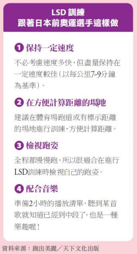 LSD並不必每天練習,10天一次即可。要注意的是,由於速度較慢,腰部會不自覺向下掉,姿勢容易崩解,因此隨時提醒自己保持正確姿勢。另外,在跑的過程中即使感到心情愉悅,也不要任意提升速度。