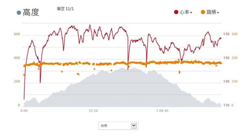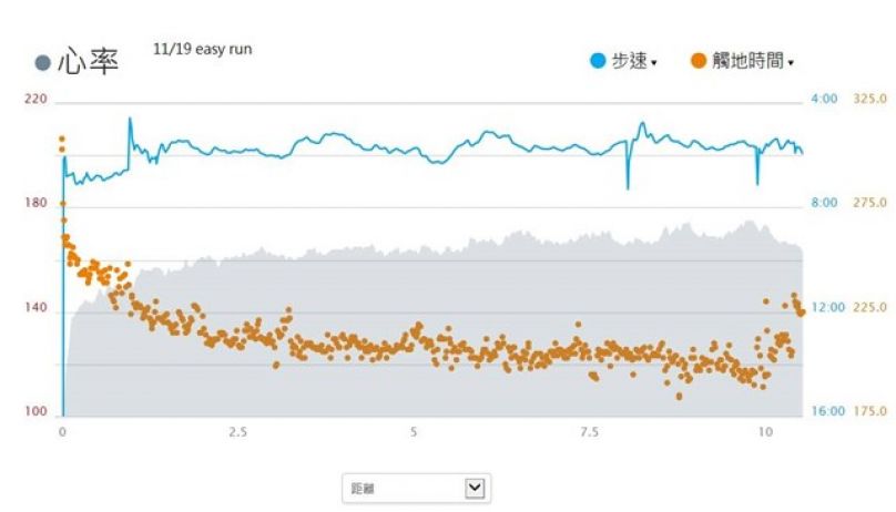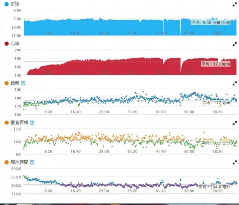 因為是輕鬆跑, 所以步頻並沒有很高, 平均值為173, 最高也只有184.