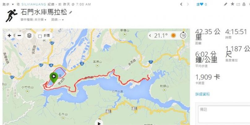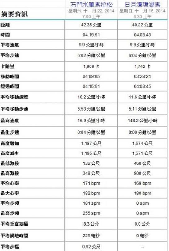 在使用garmin connect 中, 有一個"比較活動"的功能, 很想試用看看. 以上周的日月潭環湖馬(心率器沒有正常運作, 資訊有誤)和石門水庫馬來做比較, 只看見比較步速, 及活動摘要資訊, 似乎功能還不充裕. 如果同一場地, 既可以比較步速, 又可以觀測其他指標, 或許參考價值更多吧!