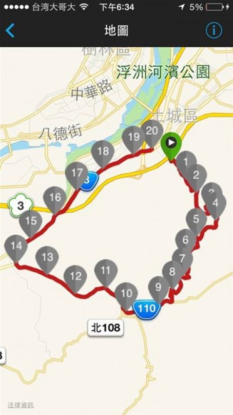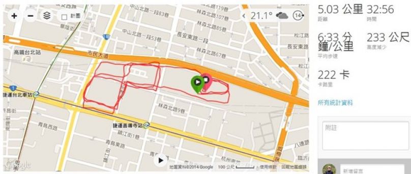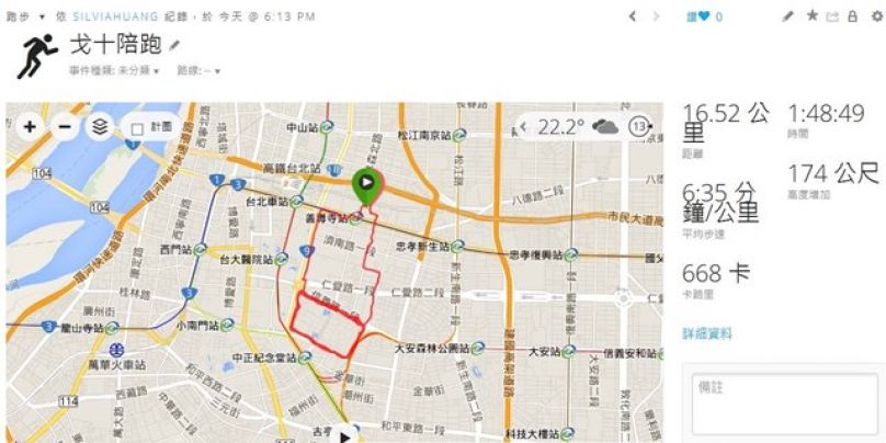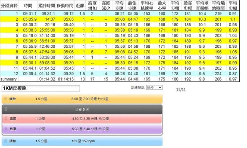 周二: 今天要來練跑新增的訓練計劃: 1公里反覆跑. 設計的內容是{1.5公里熱身+5趟的1公里反覆跑+1.5公里cool down}共13公里.