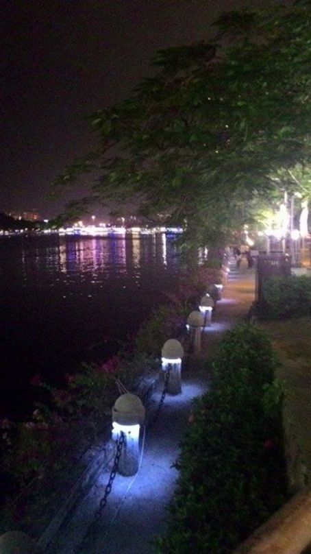 我很少到高雄, 也沒到過愛河遊覽, 透過google先找好方位. 傍晚從飯店出發, 天氣真是好, 延著河岸往出海口方向跑, 過了觀光酒吧位置後, 跑在自行車道上, 一路上少少的自行車經過, 大多是我一個人跑在不太明亮的車道上. 距離到達設定的目標7.5K後, 雖未到出海口, 還是原路折返回飯店. 路上不免俗的, 請路人幫我在地標拍了一些照片.